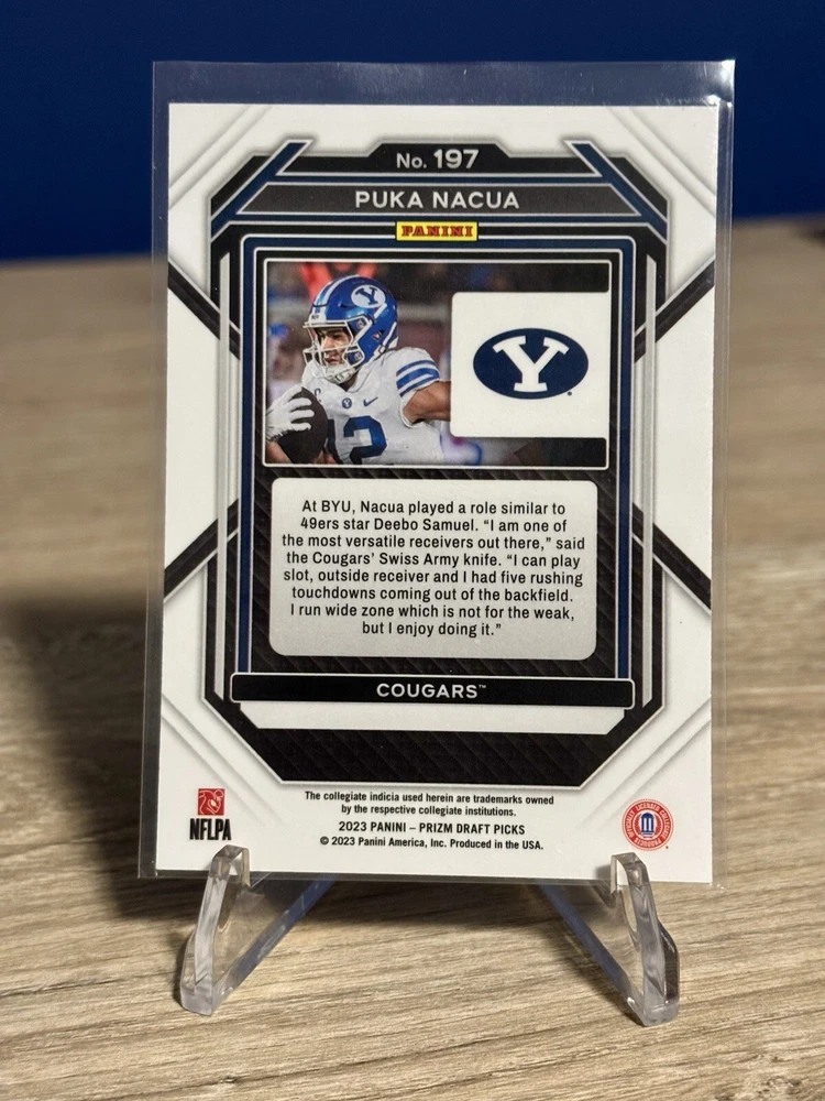 Sport:FootballCard Number:197League:National Collegiate Athletic Association (NCAA)Set:2023 PaniniType:Sports Trading CardSeason:2023Autographed:NoTeam:Los Angeles Rams, BYU CougarsPlayer/Athlete:Puka NacuaManufacturer:PaniniFeatures:Rookie, Base Set