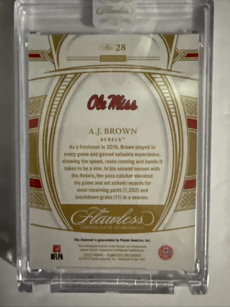 The product is a 2023 Panini Flawless Collegiate trading card featuring A.J. Brown from the Ole Miss Rebels, Tennessee Titans, and Philadelphia Eagles. It is a Diamond Gem parallel variety, serial numbered to /25. The card is in near mint or better condition and includes limited edition and collectors edition features. It is an insert card with memorabilia and has the card number D-25 for the 2023 season.