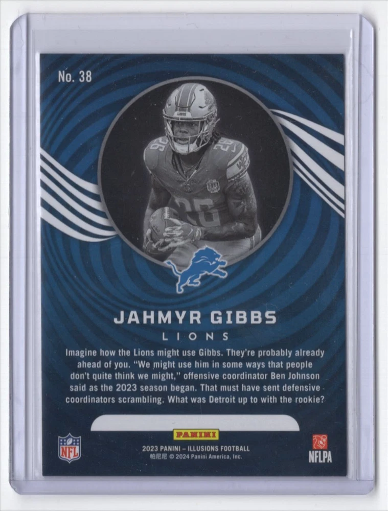 Player/Athlete: Jahmyr Gibbs Franchise: Football Game: Unspecified Manufacturer: Panini Illusions Retail Graded: No Team: Detroit Lions Features: Rookie Character: Jahmyr Gibbs Vintage: No Set: Panini Illusions Retail < Autographed: No Year Manufactured: 2023 Card Name: 2023 Panini Illusions Retail < Jahmyr Gibbs Rookie Detroit Lions Card Size: 4" x 3" Season: 2023 Sport: Football Card Number: 38 Type: Sports Trading Card Original/Licensed Reprint: Original