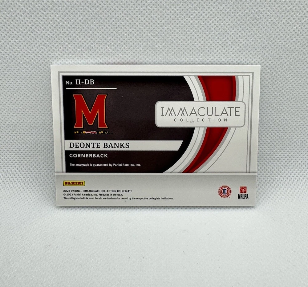 Discover the 2023 Panini Immaculate Collection Deonte Banks Introductions Rookie Card, a must-have for football enthusiasts and collectors alike. Featuring the promising talent, Deonte Banks, this trading card is a valuable piece from the 2023 Panini Immaculate Collegiate Collection. With its limited release, only 99 cards exist, making it a rare addition to any collection.The card boasts an auto signature from Banks, capturing his early career momentum. It's a tribute to his athletic journey and a collector's gem from the Sports Trading Card realm. The card is carefully crafted by Panini, a trusted name in sports memorabilia, ensuring quality and authenticity for enthusiasts and investors.
