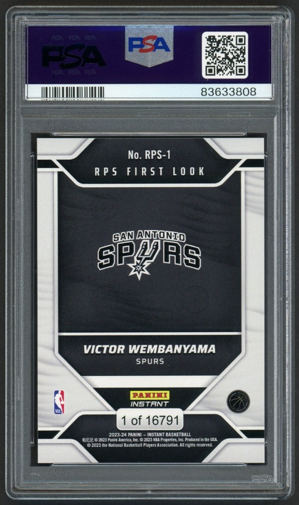 Type: Sports Trading Card Certification Number: 83633808 Card Size: Standard Features: Rookie Autographed: No Original/Licensed Reprint: Original Team: San Antonio Spurs Language: English Player/Athlete: VICTOR WEMBANYAMA Country/Region of Manufacture: United States Sport: Basketball Year Manufactured: 2023 Grade: 10 Manufacturer: Panini Product: Single Professional Grader: Professional Sports Authenticator (PSA) Original/Reprint: Original Season: 2023 Card Name: RPS FIRST LOOK League: National Basketball Association (NBA) Era: Modern (1981-Now) Set: 2023 PANINI INSTANT Card Number: RPS-1 Theme: Sport Card Attributes: Rookie