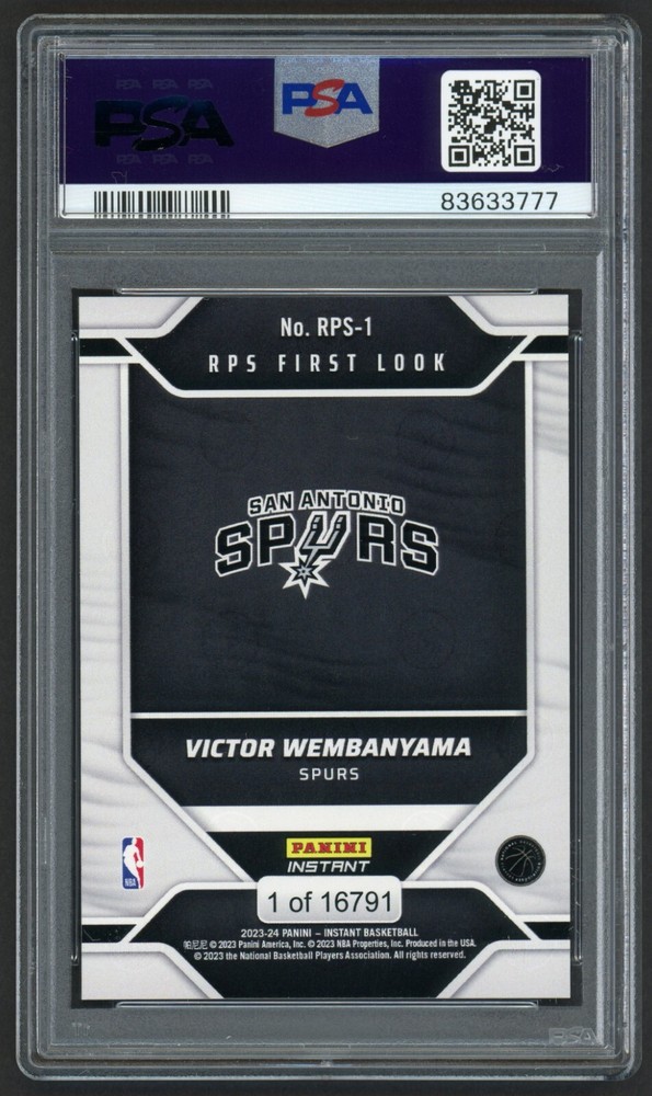 Certification Number: 83633777 League: National Basketball Association (NBA) Professional Grader: Professional Sports Authenticator (PSA) Language: English Card Name: RPS FIRST LOOK Grade: 9 Manufacturer: Panini Player/Athlete: VICTOR WEMBANYAMA Card Attributes: Rookie Country/Region of Manufacture: United States Set: 2023 PANINI INSTANT Card Size: Standard Season: 2023 Original/Licensed Reprint: Original Type: Sports Trading Card Features: Rookie Year Manufactured: 2023 Autographed: No Theme: Sport Era: Modern (1981-Now) Sport: Basketball Card Number: RPS-1 Product: Single Original/Reprint: Original Team: San Antonio Spurs