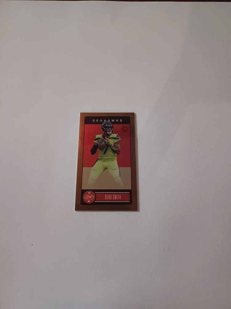 Player/Athlete: Geno Smith Manufacturer: Panini Type: Sports Trading Card Card Number: 89 League: National Football League (NFL) Parallel/Variety: Premium Edition Mini Bronze Set: 2023 Panini Legacy Season: 2023 Sport: Football Print Run: 75 Features: Serial Numbered, Parallel/Variety, Base Set Autographed: No Year Manufactured: 2023