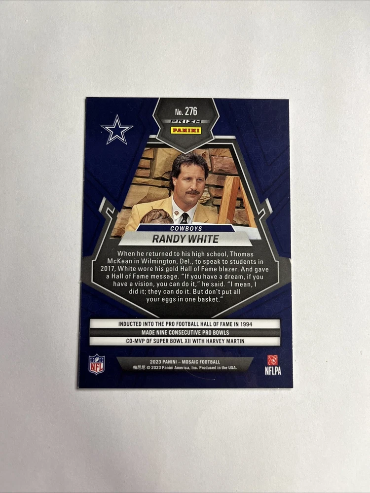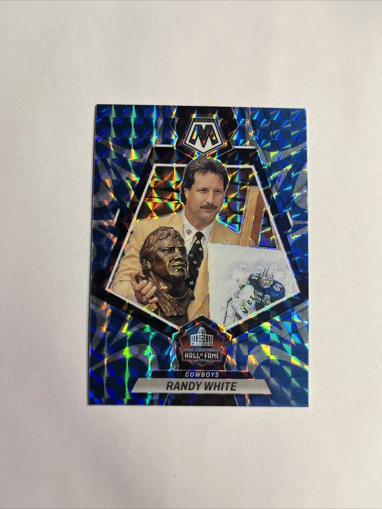 Immerse yourself in the excitement of football card collecting with the 2023 Panini Mosaic BLUE Reactive Prizm #276 featuring the legendary Randy White of the Dallas Cowboys. This striking card boasts an eye-catching blue reactive prizm finish, complementing its mosaic parallel variety, making it a standout addition to any collection. Crafted with care by Panini, the renowned card manufacturer, this piece captures the essence of the sport with its high-quality refractor features. Celebrate the heritage of the National Football League (NFL) and the illustrious career of Randy White as you add this Hall of Fame inductee's 2023 card to your assemblage of sports memorabilia.