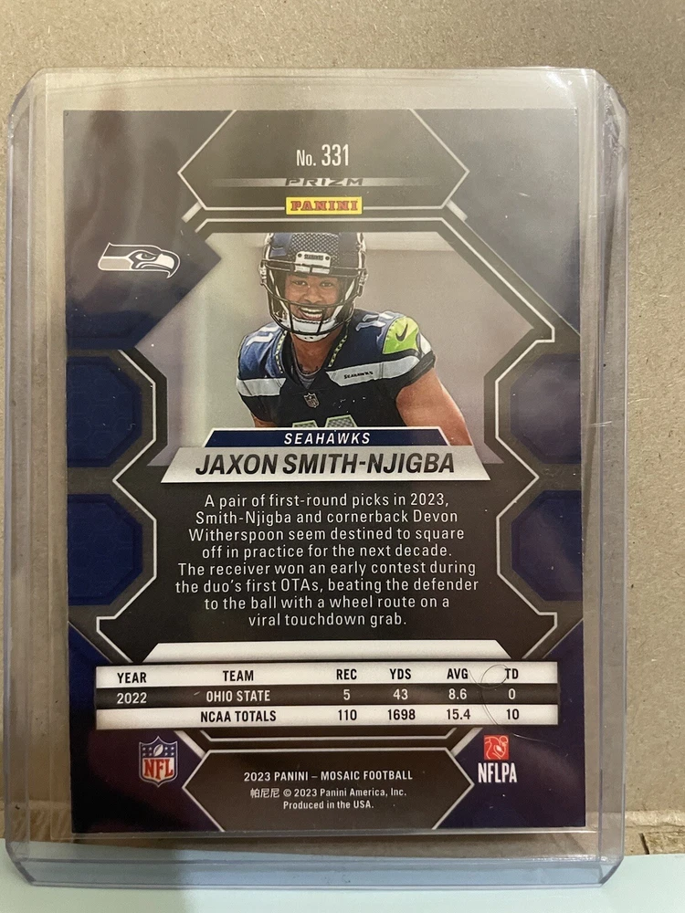 Year Manufactured: 2023 Parallel/Variety: Green Mosaic Features: Base Set, Hologram, Parallel/Variety, Rookie League: National Football League (NFL) Card Size: Standard Sport: Football Team: Seattle Seahawks Manufacturer: Panini Card Number: 331 Autographed: No Language: English Player/Athlete: Jaxon Smith-Njigba Vintage: No Type: Sports Trading Card Set: 2023 Mosaic Season: 2023