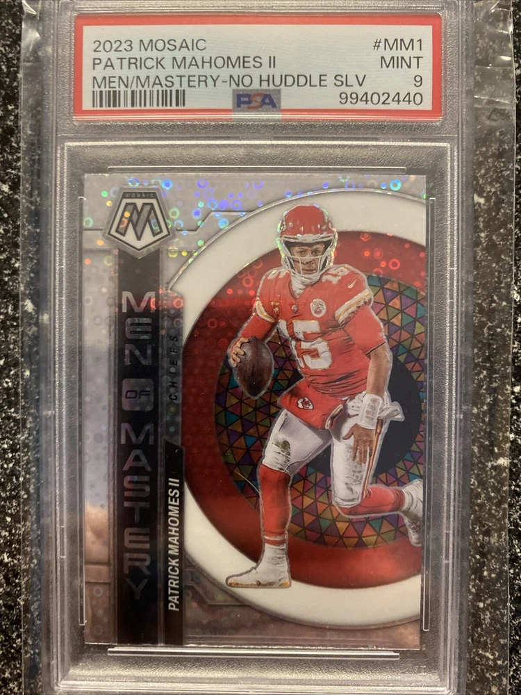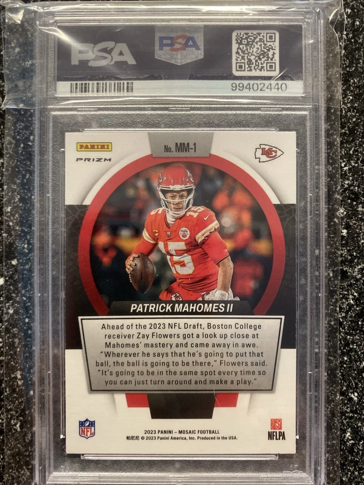 Manufacturer:PaniniPlayer/Athlete:Patrick Mahomes IISport:FootballSet:2023 Panini MosaicFeatures:InsertInsert Set:Men of MasteryLeague:National Football League (NFL)Season:2023Team:Kansas City ChiefsSeries:Panini MosaicCard Number:MM-1brand:Panini