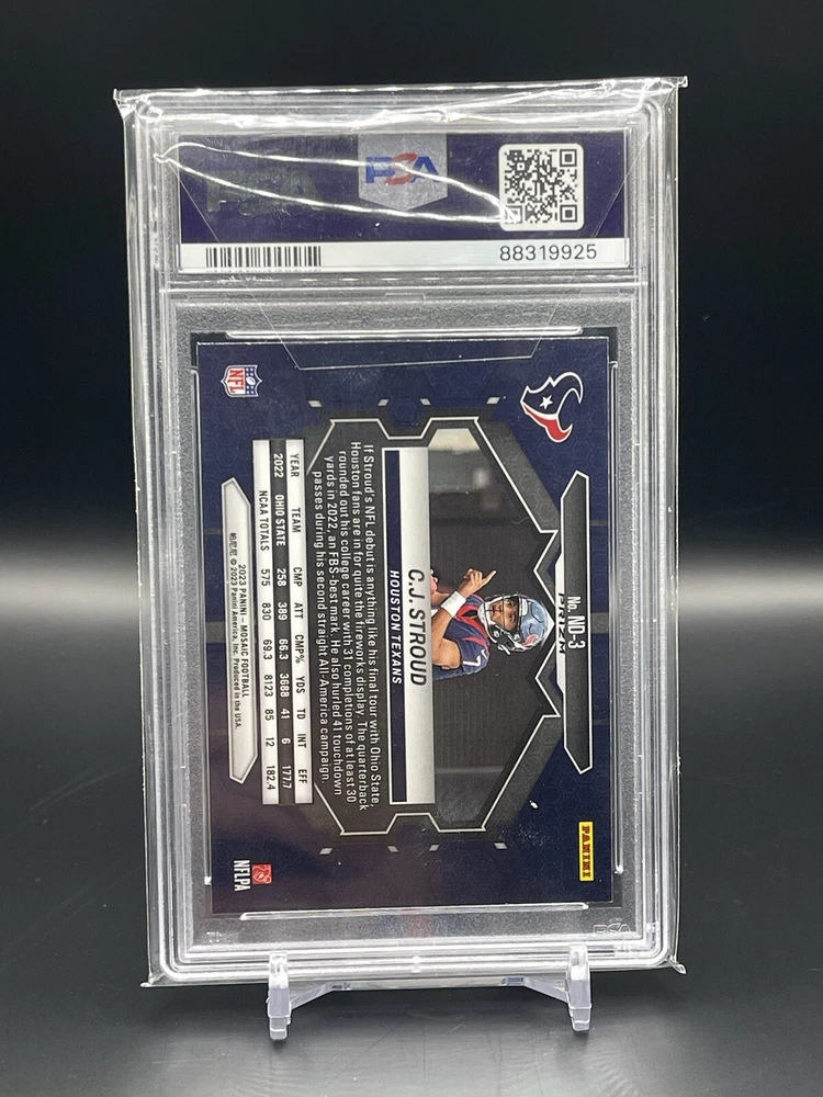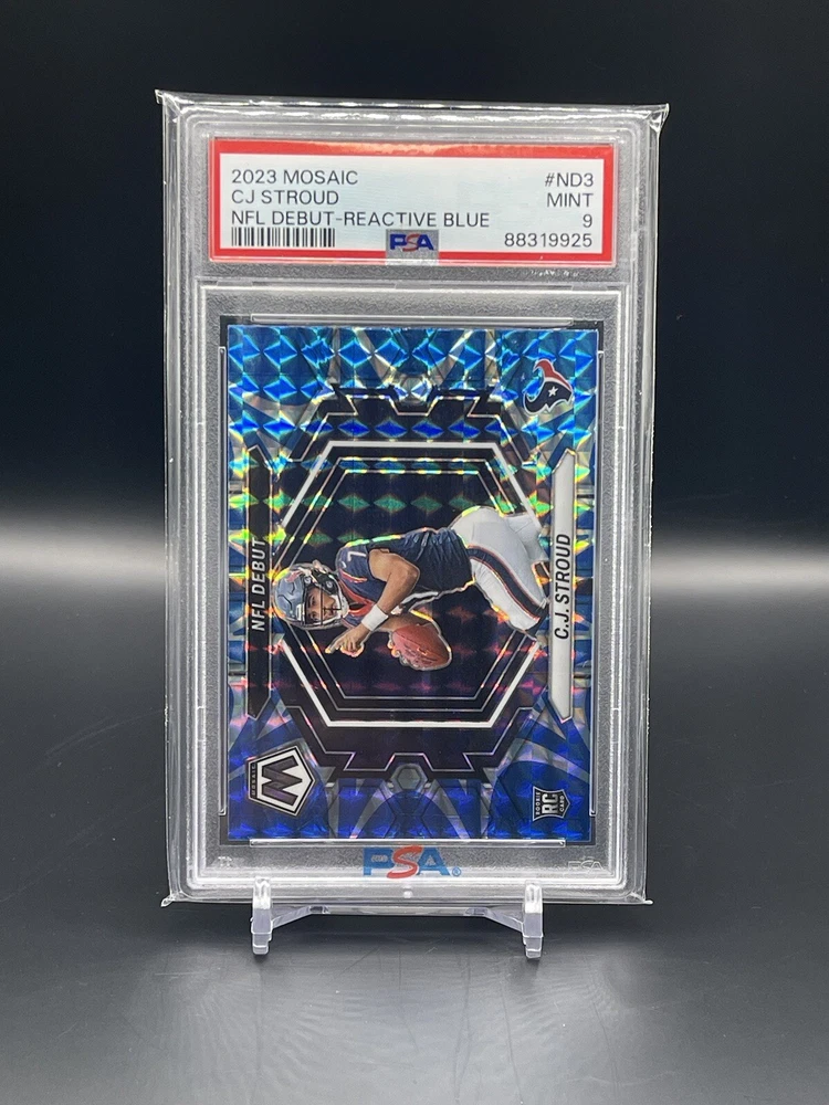 This 2023 Panini Mosaic trading card features C.J. Stroud, a promising rookie from the Houston Texans team. The card is part of the NFL Debut insert set and has a reactive blue mosaic prizm parallel/variety, making it a unique and valuable addition to any sports trading card collection. The card is ungraded and is in excellent shape, with no noticeable flaws. It is a must-have for fans of the National Football League and collectors of sports trading cards. Don't miss out on the opportunity to own this rare and highly sought-after card.