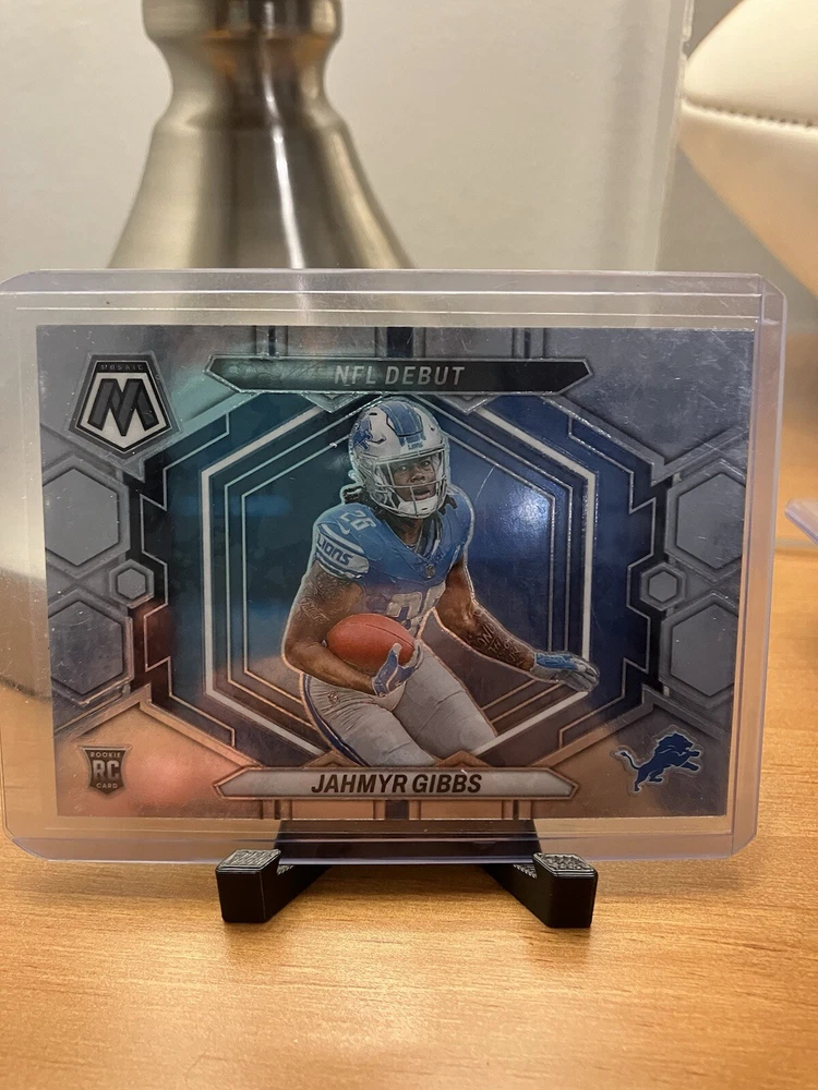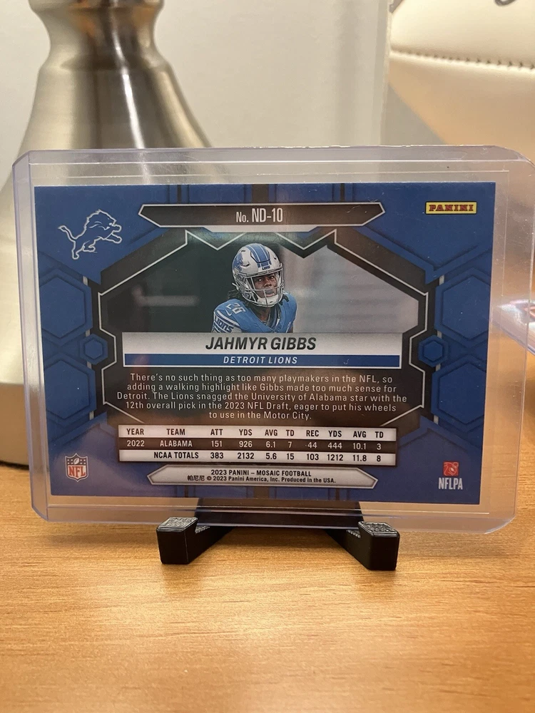 Insert Set: Nfl Debut League: National Football League (NFL) Set: 2023 Panini Mosaic Season: 2023 Parallel/Variety: Silver Prizm Card Number: ND-10 Team: Detroit Lions Type: Sports Trading Card Features: Insert, Parallel/Variety, Rookie Manufacturer: Panini Sport: Football Player/Athlete: Jahmyr Gibbs