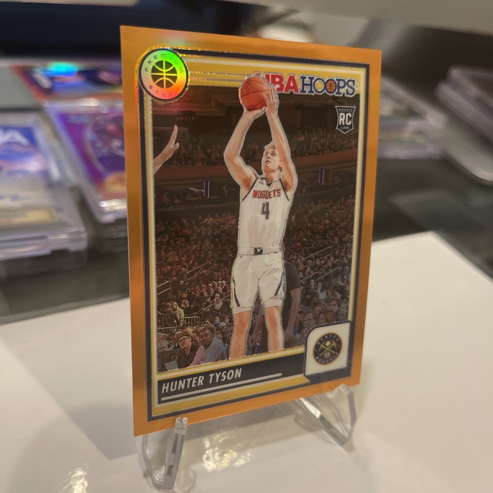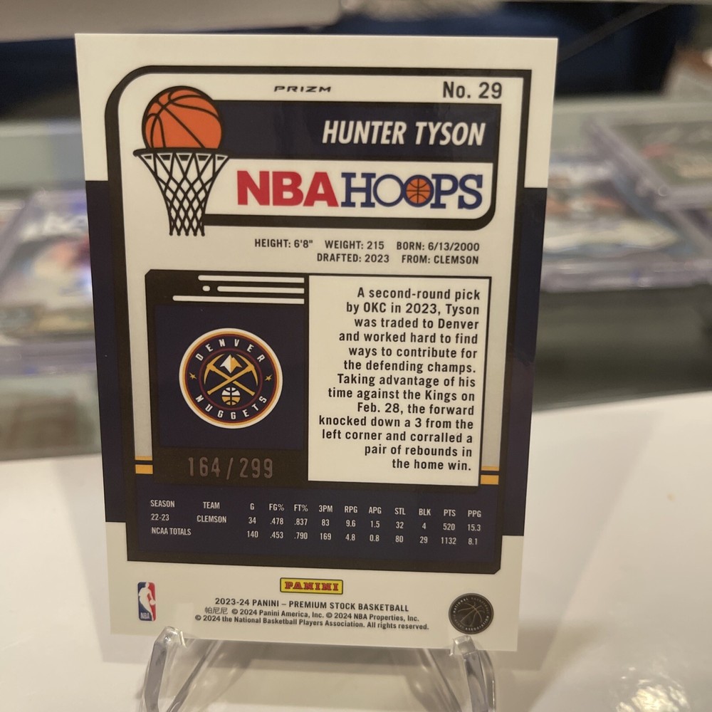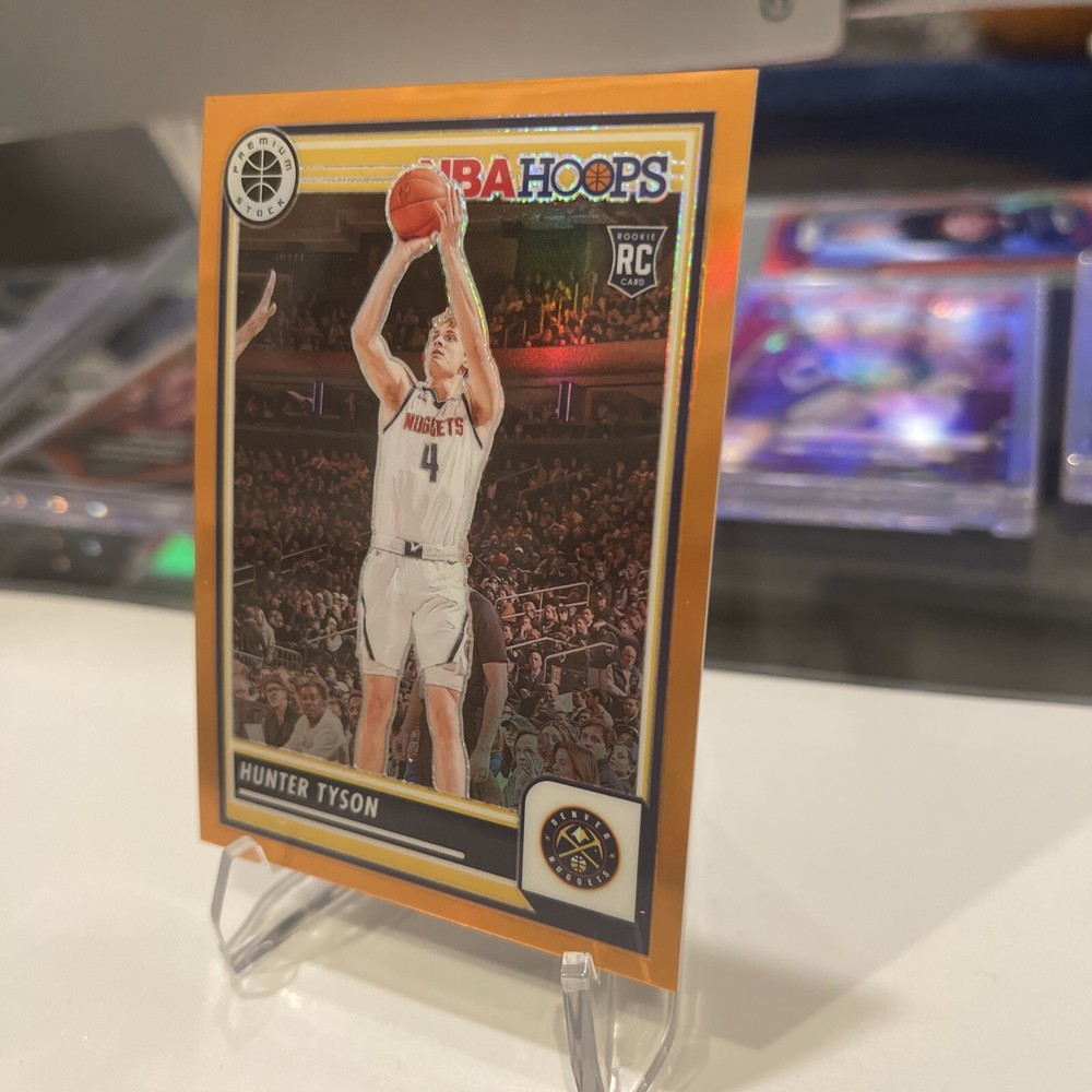 This is a 2023-24 Panini NBA Hoops Premium Stock trading card featuring Hunter Tyson of the Denver Nuggets. The card is a Rookie card with an Orange Prizm parallel variety, numbered out of 299 copies, making it a rare find for collectors. Manufactured by Panini, this sports trading card is part of the 2023-24 set and showcases Tyson in his Nuggets jersey. This card is a valuable addition to any basketball card collection, especially for fans of Hunter Tyson or the Denver Nuggets.