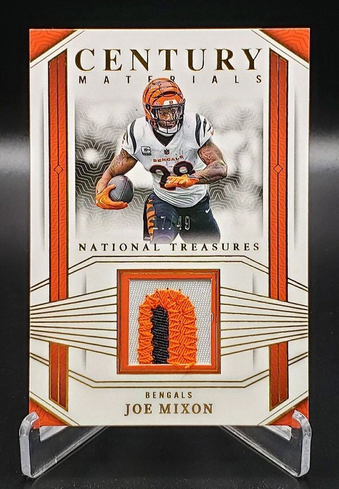 Thank you for stopping by Woodfin Collectibles (Combined Shipping Is Always Provided) Description 2023 Panini National Treasures /49 Joe Mixon Century Materials #CEN-JMN Condition This item is "USED". Please look at all images carefully as this is this item you will receive. The images in this listing are actual photos and are representative of the items description. Upon request, we can take more photos or provide further details about this item. If you have any questions, please make them prior to making a purchase. Shipping & Handling All orders will ship within two business days. Any order placed after 2:00 PM EST on Friday will not ship until the following Tuesday. Individual cards will be shipped in a thick envelope and larger items will be shipped in a bubble mailer or small box. There are no refunds or returns on trading cards unless we are at fault with the order. We have a strong commitment to customer service and strive for 100% satisfaction with the product you receive. Please let us know if you are dissatisfied with any part of you transaction. We will be sure to correct the problem in a prompt and courteous manner. We always appreciate positive feedback and welcome all questions, suggestions and concerns via eBay messenger. Please take a look at our other items and check out our eBay store. Once again, thank you for looking.