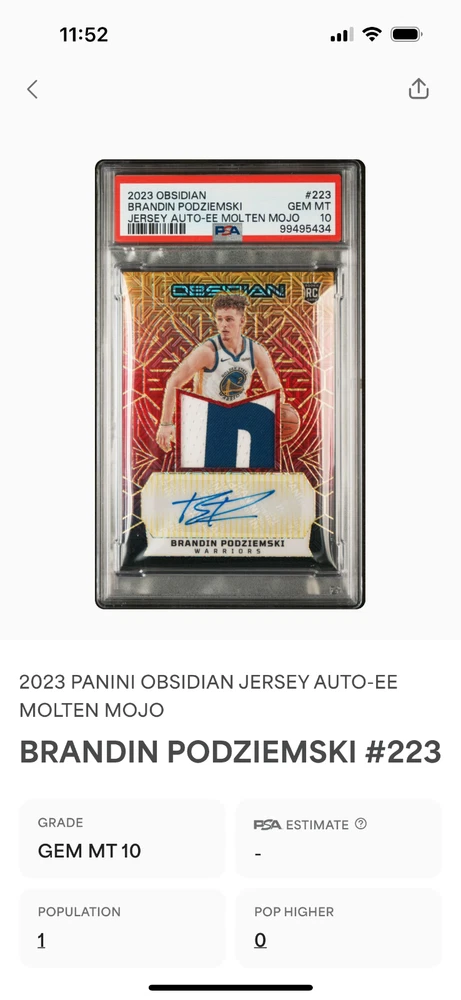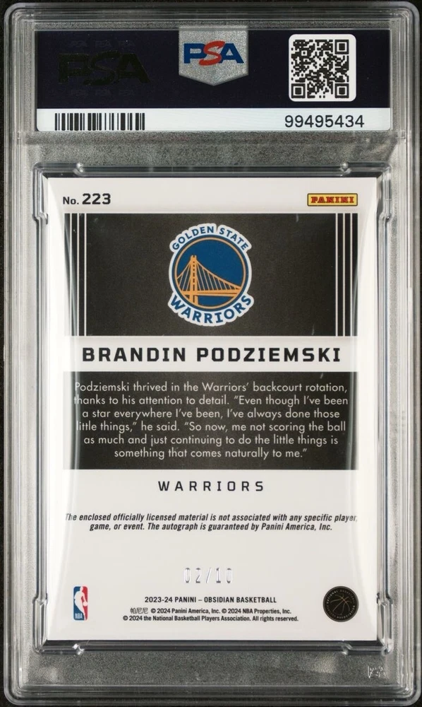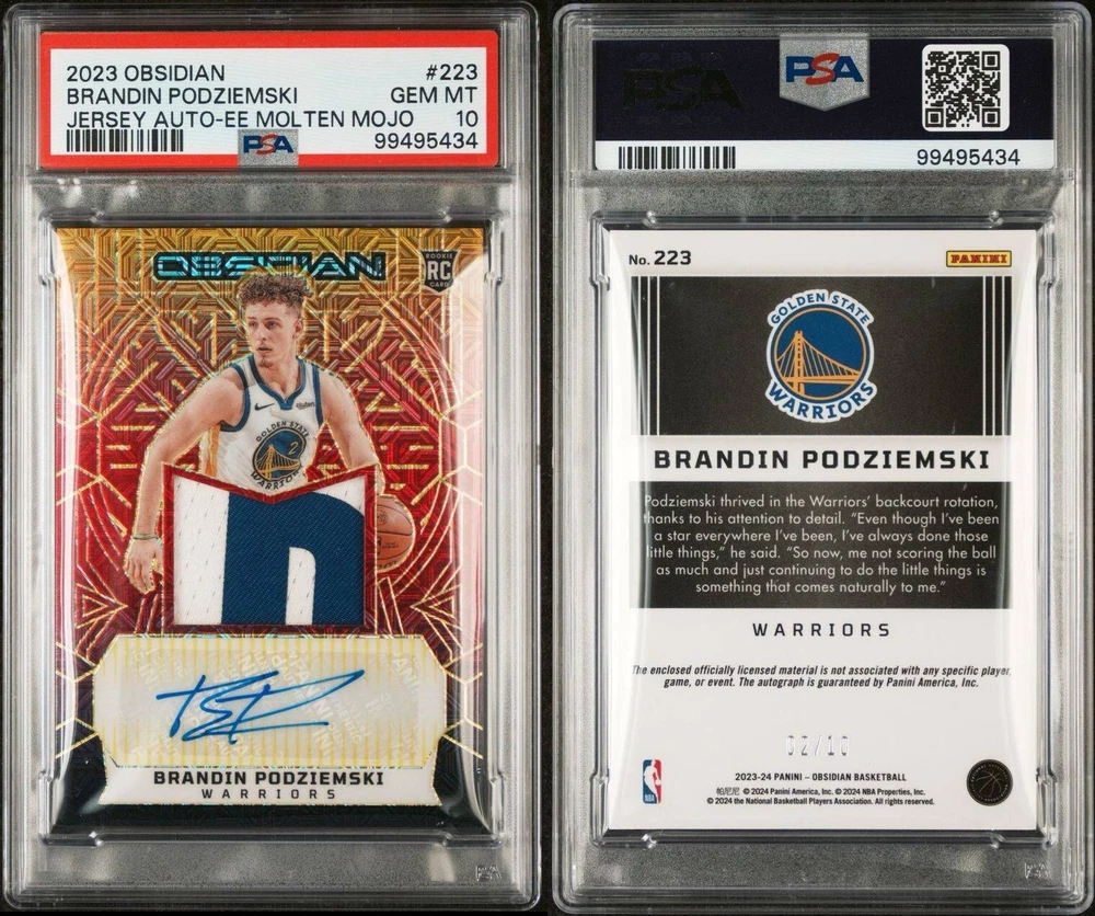 JERSEY NUMBER 02/10 POP 1 PSA 10 LETTER PATCH VERTICAL ROOKIE PATCH AUTO HIGHEST GRADED CARD IN THE WORLD ONLY 1 IN THE WHOLE WORLD VERY HARD CARD TO GEM (THICK) This is a 2023 Panini Obsidian trading card featuring basketball player Brandin Podziemski. It is autographed by Brandin Podziemski and is a Mojo parallel variety called Electric Etch Molten. This particular card is a POP 1, meaning it is a unique collectible item. The card has been authenticated and graded by PSA as a 10.