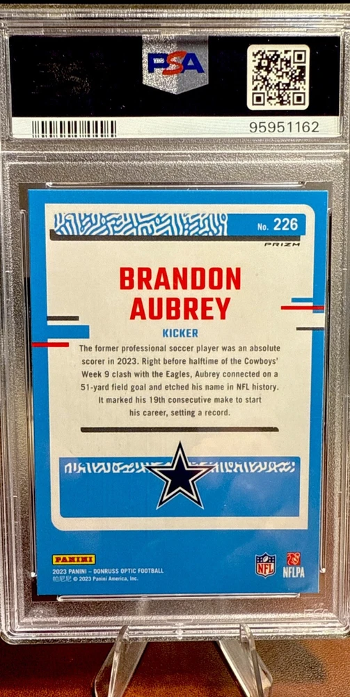 This 2023 Panini Donruss Optic Rated Rookie Purple Shock Prizm #226 Brandon Aubrey PSA 10 is a must-have for any football fan. With its stunning design and high-quality printing, this sports trading card is a true collector's item. Featuring a parallel/variety of purple shock prizm, this card is sure to stand out in any collection. The card is from the National Football League (NFL) and features Brandon Aubrey, a up-and-coming player. It is part of the base set and is a rookie card, making it even more valuable to collectors. This card is perfect for anyone who loves collecting sports trading cards and want to add a high-quality, rare item to their collection.