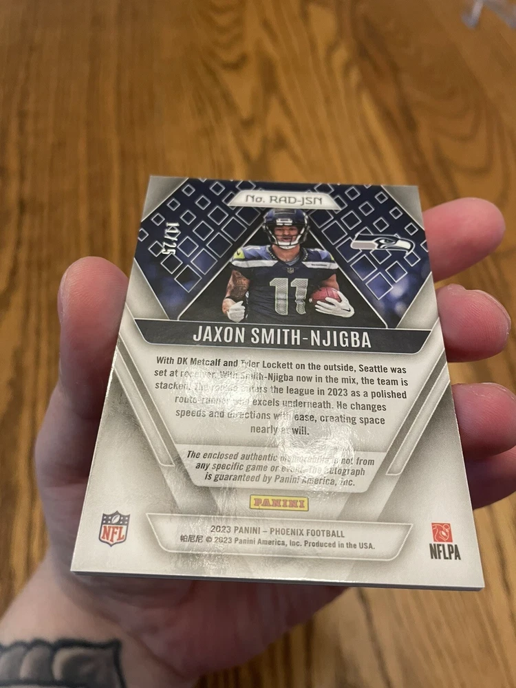 For the avid sports fans out there, this rare 2023 Panini Phoenix sports trading card is a must-have addition to your collection. Featuring Jaxon Smith-Njigba, a rookie player from the Seattle Seahawks, this card is guaranteed to impress. With an autographed premium patch and a dual laundry tag RPA red parallel variety, this card is truly a unique find. The card is limited edition, with only 25 copies produced, and is numbered RAD-JSN for easy identification. As a part of the National Football League (NFL), this card is highly sought after by collectors and enthusiasts alike. Don't miss out on the chance to own this exclusive piece of sports memorabilia.