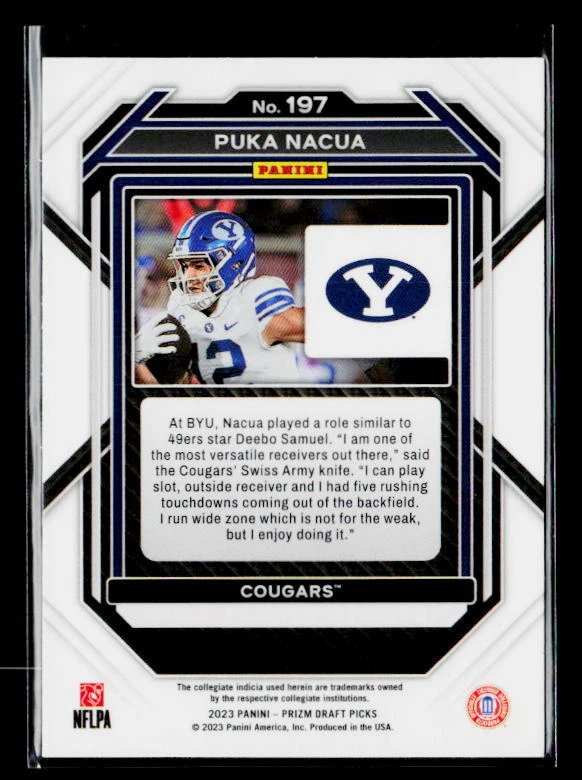 Set: 2023 Panini Prizm Draft Picks Graded: No Manufacturer: Panini Season: 2023 Year Manufactured: 2023 Player/Athlete: Puka Nacua Card Number: 197 Team: BYU Cougars Autographed: No Sport: FOOTBALL Type: Sports Trading Card League: NFL