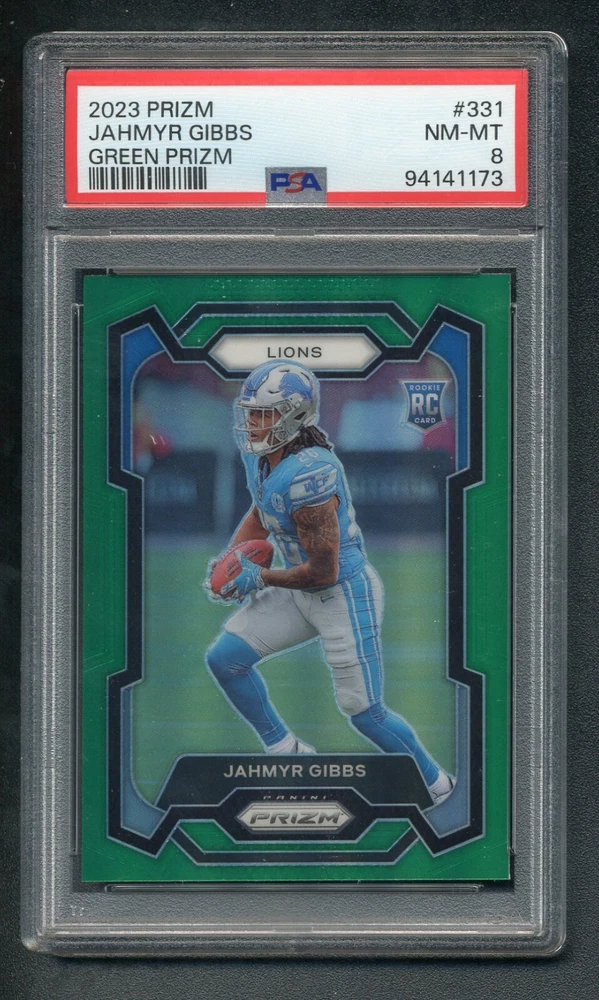 JAHMYR GIBBS 2023 PRIZM GREEN PRIZM #331 LIONS ROOKIE NM-MT PSA 8. Condition is Graded. Shipped with USPS Ground Advantage.