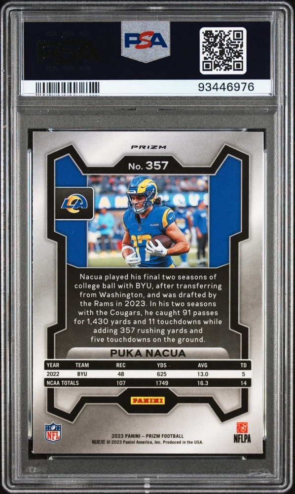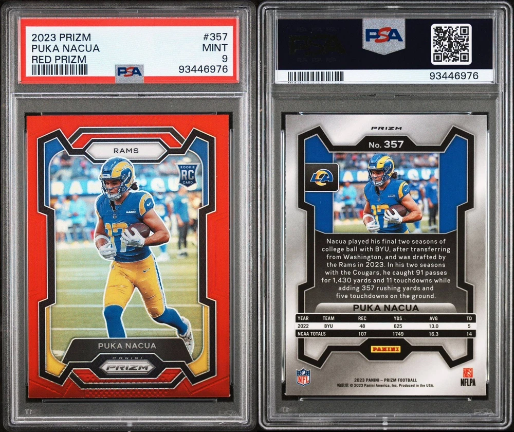Card Number: 357 Player/Athlete: Puka Nacua Additional Description: Rookies - Puka Nacua Season: 2023 brand: Panini Manufacturer: Panini Subset: Rookies Series: Panini Prizm Set: 2023 Panini Prizm Features: Parallel/Variety, Base Set, Rookie Sport: Football Parallel/Variety: Red Prizm League: National Football League (NFL) Team: Los Angeles Rams