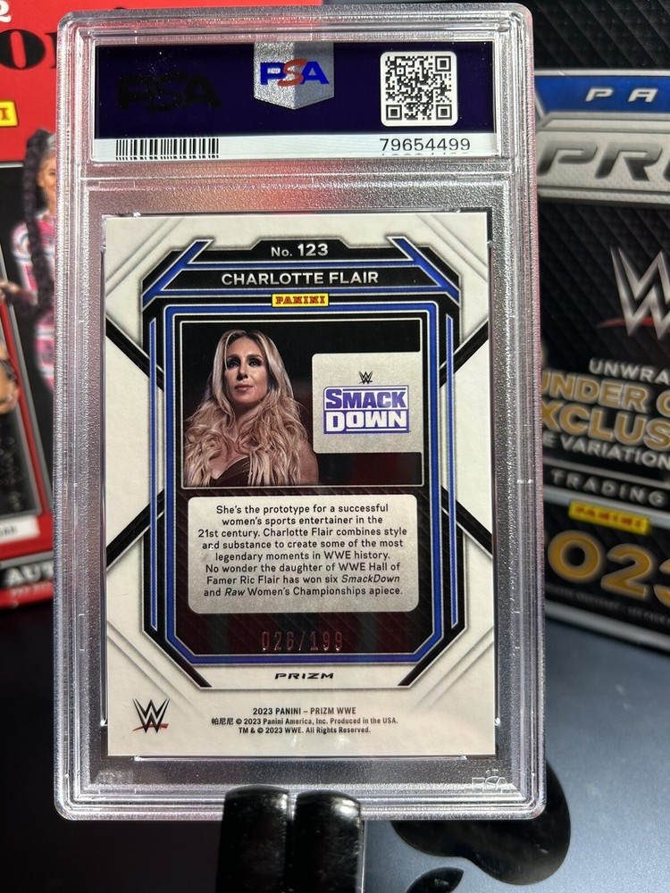 CHARLOTTE FLAIR: 2023 Panini Prizm WWE🔥#/199 PANDORA PREMIUM BOX🔥PSA 9 Mint Card will be well protected and shipping can be combined with other purchases!