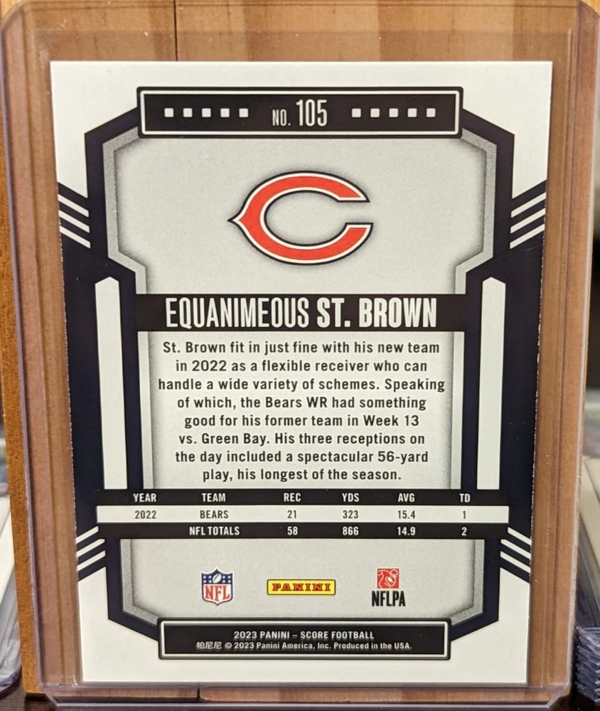 This 2023 Panini Score #105 Equanimeous St. Brown trading card is a must-have for any fan of the National Football League (NFL). Featuring the star wide receiver of the Chicago Bears, this card is in near mint or better condition. The card will also ship in a penny sleeve and top loader to maintain the existing condition. Whether you're a fan of Equanimeous St. Brown or the Chicago Bears, this card is sure to impress. Add this card to your collection today and show off your love for the sport.