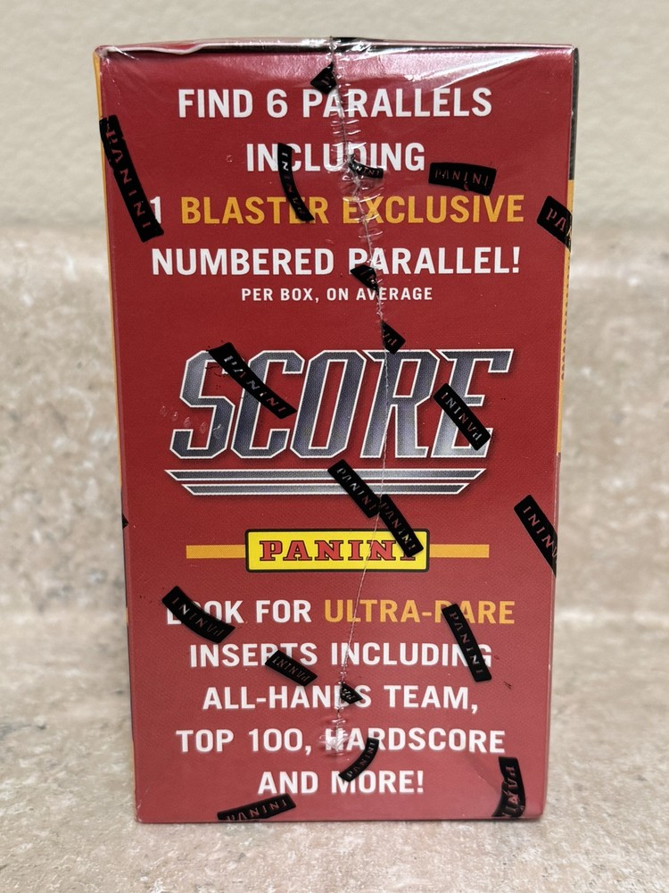 The 2023 Panini Score Football Blaster Box contains 132 cards in a standard size from the National Football League (NFL) set. Manufactured in 2023 by Panini, this box features a mix of paperboard, card stock, paper, and plastic materials. It includes a base set, exclusive cards, rookie cards, parallel cards, and insert cards, making it an exciting purchase for football card collectors. This box offers a variety of cards to collect and enjoy from the 2023 football season.