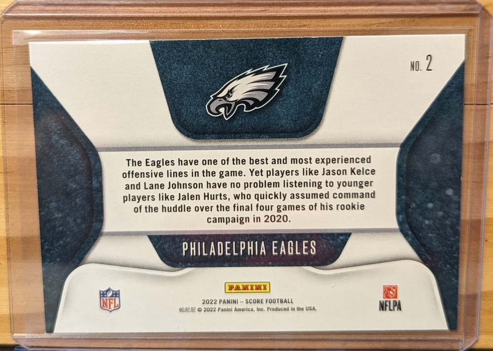 Attention Philadelphia Eagles fans! Add this rare 2023 Panini Score Huddle Up trading card to your collection. Featuring the iconic team logo and players huddled up for the next play, this card is a perfect addition for any football fan. With its base set and insert features, it's a must-have for collectors. The card is raw and ungraded, but will ship in a penny sleeve and top loader to maintain its existing condition. This sports trading card is numbered 2 in the set, so don't miss out on the chance to own a piece of NFL history. Get it now before it's gone!