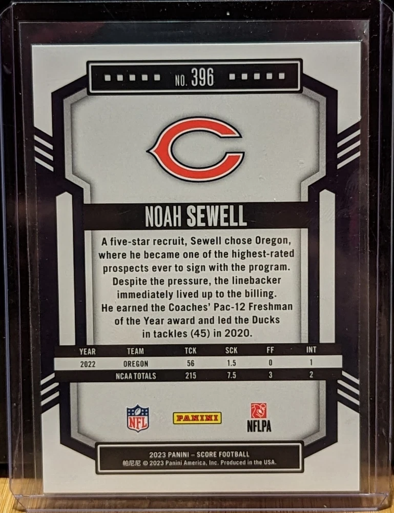This 2023 Panini Score #396 Noah Sewell Rookie card is a must-have for any fan of football. With its sleek design and impressive features, this sports trading card is sure to be a valuable addition to your collection. The card is ungraded and in near mint or better condition and will ship in a penny sleeve and top loader to maintain the existing condition, making it a great investment for any collector. Featuring Noah Sewell, a standout player from the Oregon Ducks and now a member of the Chicago Bears, this card is perfect for fans of both college and professional football. This card is a great choice for anyone looking to add a high-quality football card to their collection.