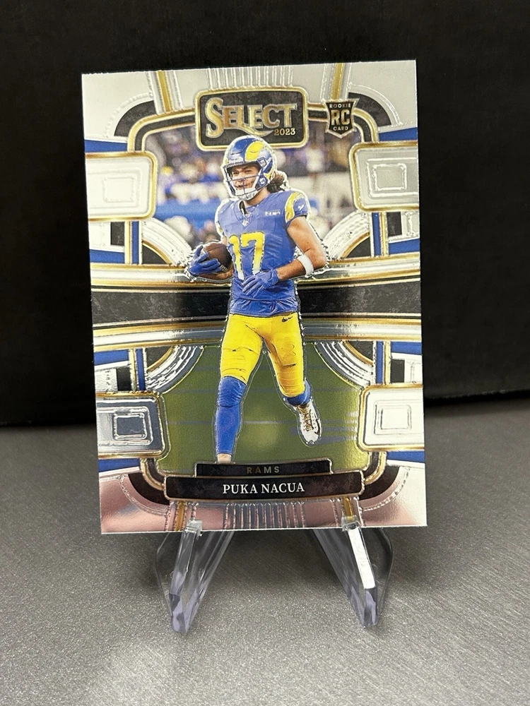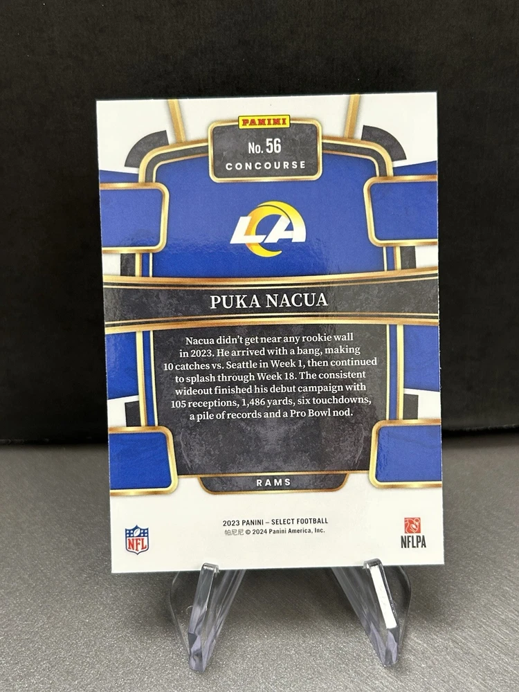 This 2023 Panini Select sports trading card features Puka Nacua, a rookie player for the Los Angeles Rams in the NFL. The card number is 56 and it is part of the Concourse Rams set. It is a great addition to any football fan's collection. The card is manufactured by Panini and is from the 2023 season. The card is not autographed and has no visible signs of wear or damage.