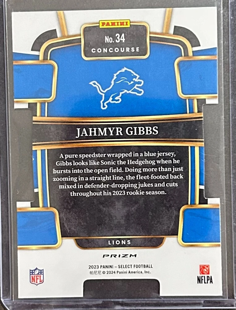 Features: Parallel/Variety, Base Set, Rookie Manufacturer: Panini Set: 2023 Panini Select League: National Football League (NFL) Card Number: 34 Type: Sports Trading Card Sport: Football Season: 2023 Team: Detroit Lions Parallel/Variety: Silver Prizm Die-Cut Player/Athlete: Jahmyr Gibbs