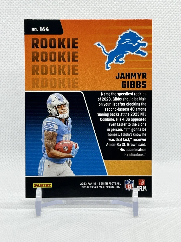 Experience the thrill of collecting with this 2023 Panini Zenith Red Zone Rookie sports trading card featuring Jahmyr Gibbs of the Detroit Lions. This card in near mint or better condition is a must-have for any football fan and collector. The card number 144 is a part of the 2023 Panini set and is parallel/variety Red Zone. This card is manufactured by Panini and has amazing features like being a rookie card. Add this card to your collection today and show off your love for the sport. Don't miss out on the opportunity to own this stunning card.