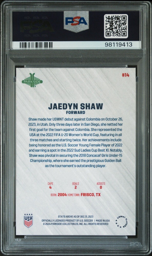 2023 Parkside USWNT Recap Jaedyn Shaw Rookie Auto Card RC #14 PSA MINT 9/GEM 10. Condition is Graded. Shipped with UPS Ground Saver.
