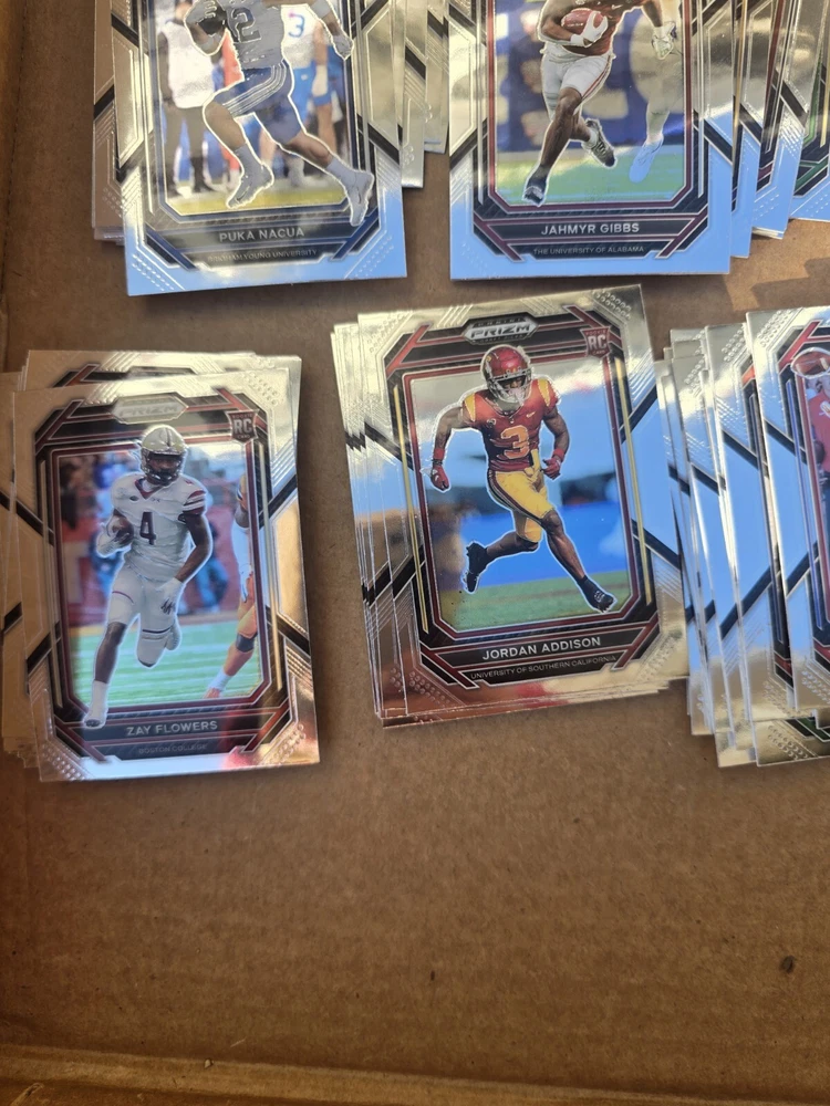 OVER 80 CARD LOT!! (Actually 92 rookie cards) ALL ROOKIES ALL THE BIGGEST NAMES.. CHEAPEST PRIZM ROOKIES YOU WILL FIND This 80+ card lot is a must-have for any football fan looking to add to their trading card collection. The 2023 Panini Prizm Draft Picks set features rookie cards of top players like Bijan Robinson, Jahmyr Gibbs, May Flowers, Tank Bigsby, Jordan Addison, Devon Achane, and Puka Nakua. The cards are perfect for collectors who want to complete their set and showcase their passion for the sport. Manufactured by Panini, the cards are of high quality and are sure to impress any collector. Don't miss out on this opportunity to own a piece of football history.