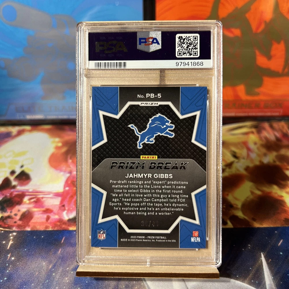 This 2023 Panini Prizm trading card features Jahmyr Gibbs, a rookie player for the Detroit Lions in the National Football League (NFL). The card is part of the Prizm Break insert set and has a unique Purple Power Prizm parallel/variety. It is also serial numbered and has a card number of PB-5. The card is in excellent shape and has been graded a PSA 9 Mint. It is a must-have for any football fan or trading card collector. Don't miss your chance to add this rare and highly sought-after card to your collection.