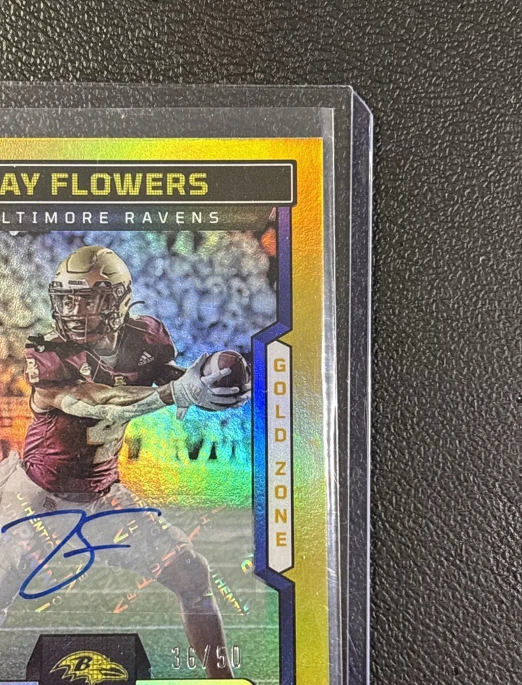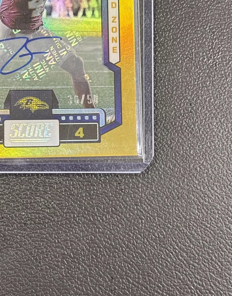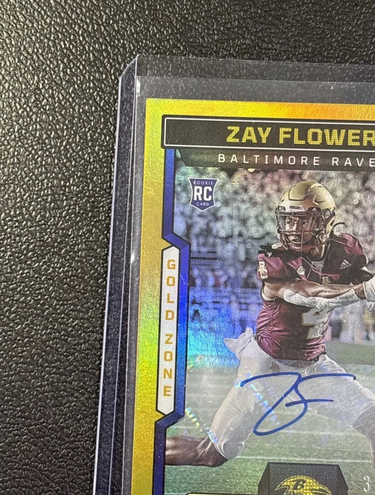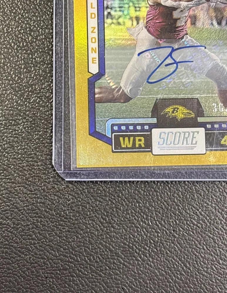 2023 Score Zay Flowers Gold Zone Rookie Auto #’d 36/50 Baltimore Ravens Will ship in top loader same or next day.