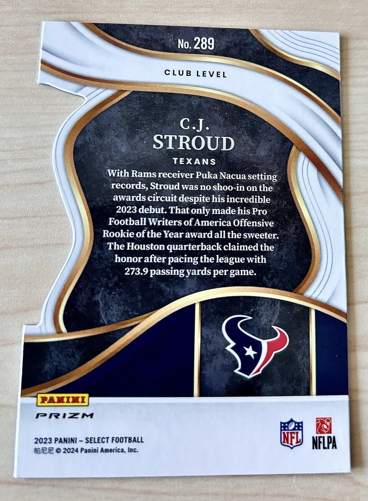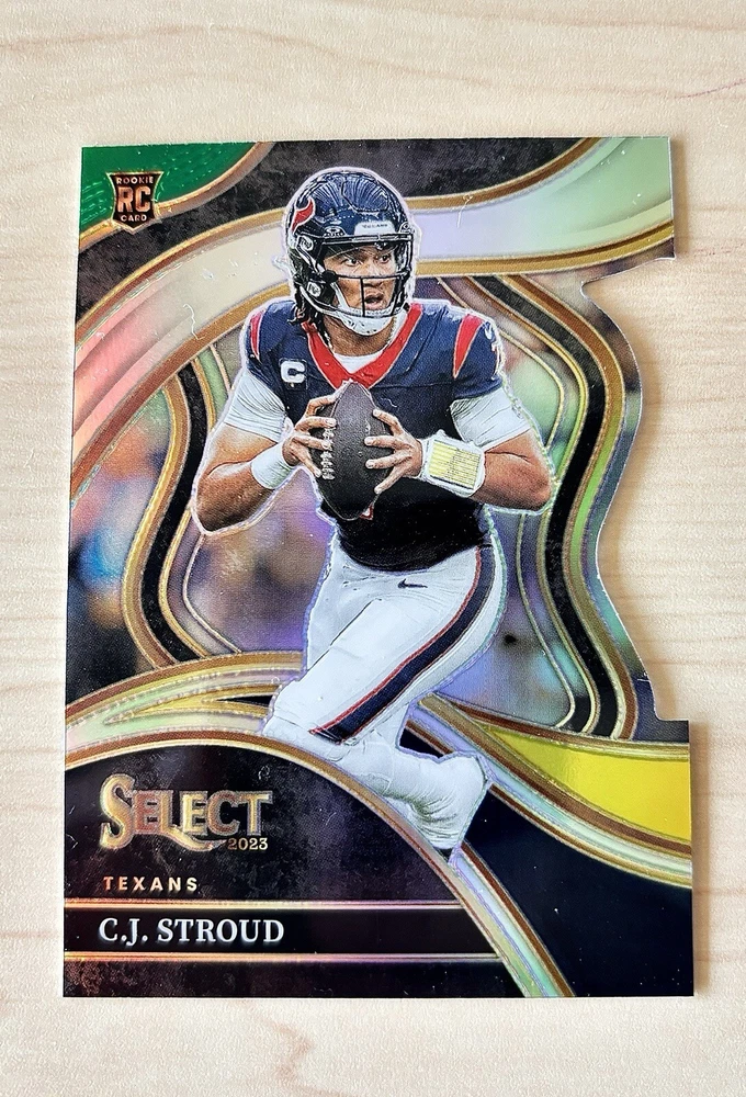 Manufacturer: Panini League: National Football League (NFL) Sport: Football Set: 2023 Panini Select Card Name: 2023 Panini Select Autographed: No Team: Houston Texans, Ohio State Buckeyes Player/Athlete: C. J. Stroud Card Number: 289 Features: Chase, Rookie, Parallel/Variety, Memorabilia Year Manufactured: 2023 Parallel/Variety: Green & Yellow Prizm Die-Cut Type: Sports Trading Card Signed By: N/A Card Size: Standard Season: 2023