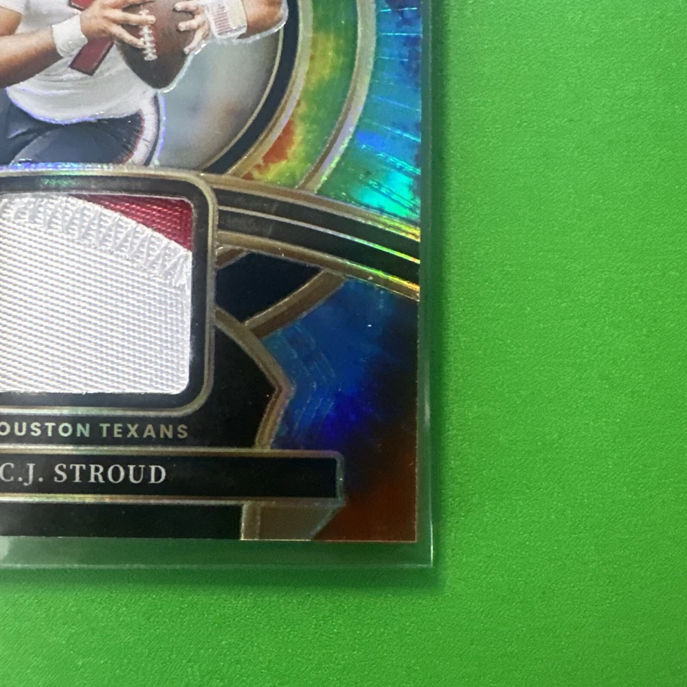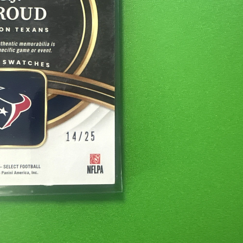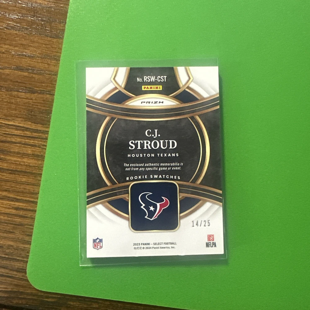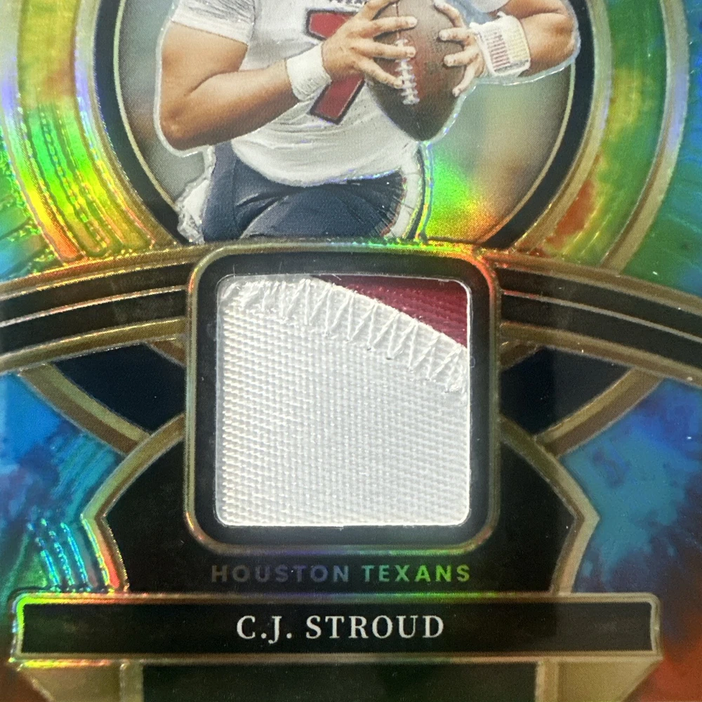 Manufacturer: Select Team: Houston Texans Season: 2023 Set: 2023 Select Player/Athlete: C. J. Stroud Features: Memorabilia, Rookie Sport: Football Autographed: No Card Number: 14/25 Type: Sports Trading Card League: National Football League (NFL) Year Manufactured: 2023 Parallel/Variety: Tie-Dye Print Run: /25