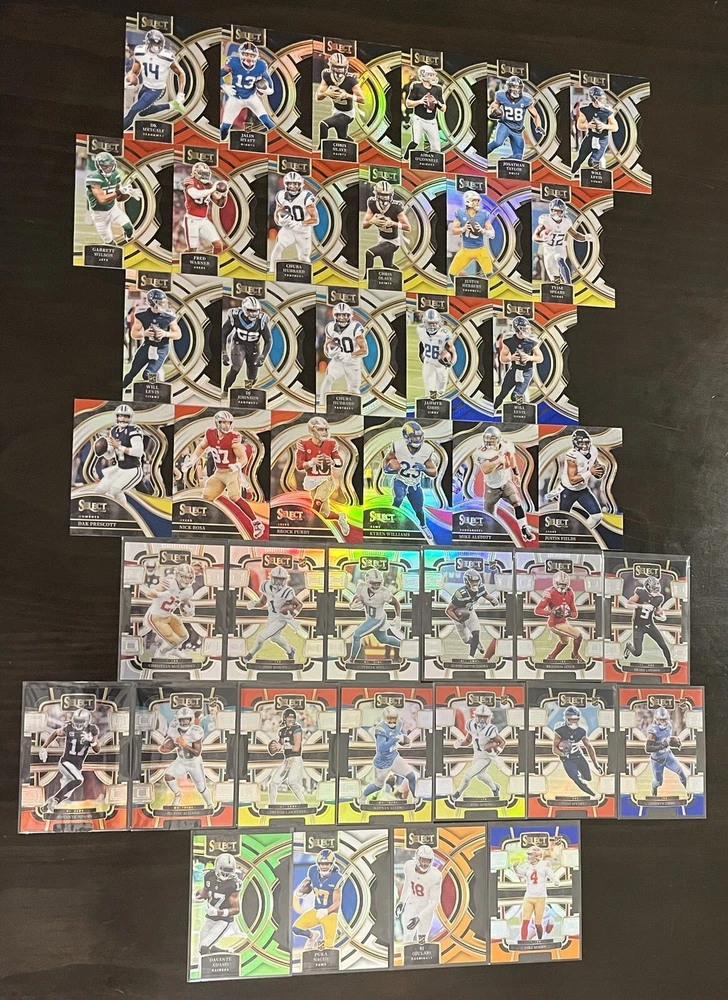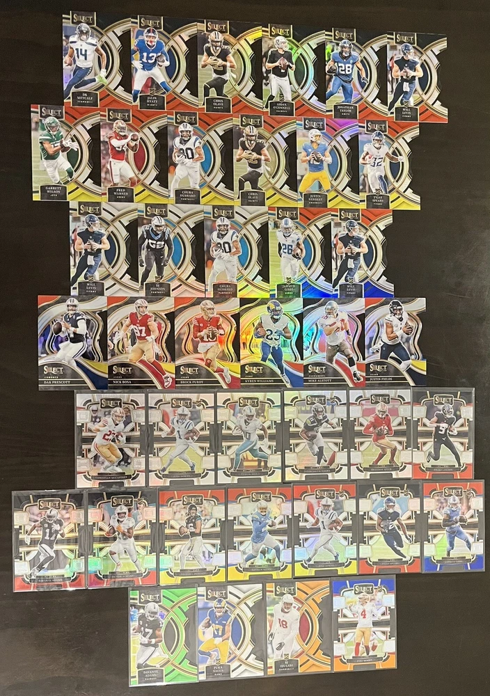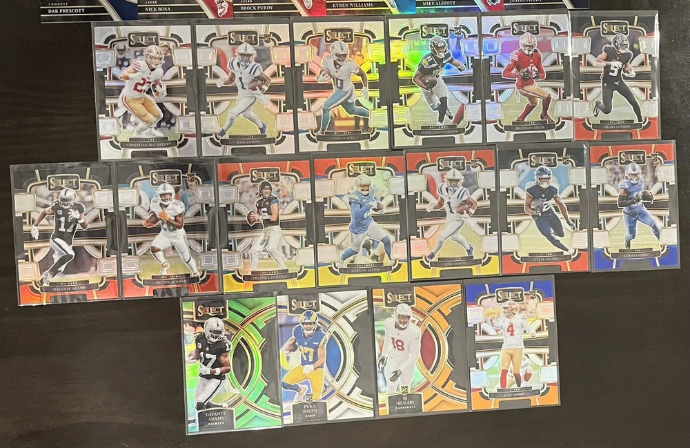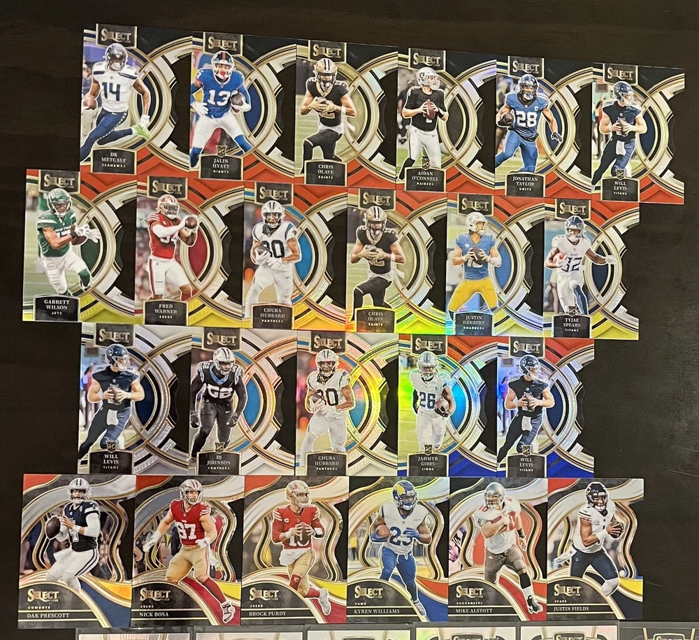 BJ Ojulari /399 Jake Moody /35 Kyren Williams Mike Alstott Justin Fields Drake London Brandon Aiyuk Jaxon Smith-Njigba Tyreek Hill Josh Downs Christian McCaffrey Jahmyr Gibbs Aidan O’Connell DK METCALF Jalen Hyatt Chris Olave Jonathan Taylor Will Levis Garrett Wilson Fred Warner Chuba Hubbard Justin Herbert Tyjae Spears DJ Johnson Dak Prescott Nick Bosa Brock Purdy Keenan Allen Trevor Lawrence Dev’Von Achane