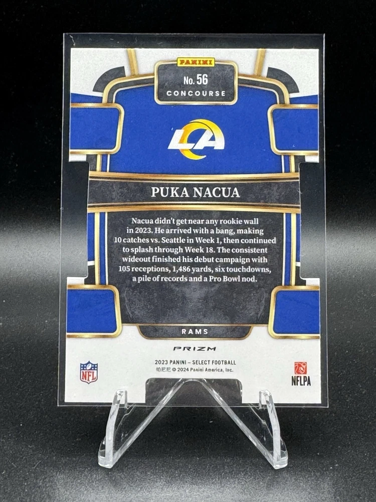 Card Name:Silver Die-CutCard Number:56Player/Athlete:Puka NacuaAutographed:NoSport:FootballSet:2023 SelectTeam:Los Angeles RamsSeason:2023Features:Insert, Parallel/Variety, Rookie, Die CutType:Sports Trading CardManufacturer:SelectParallel/Variety:SilverLeague:National Football League (NFL)