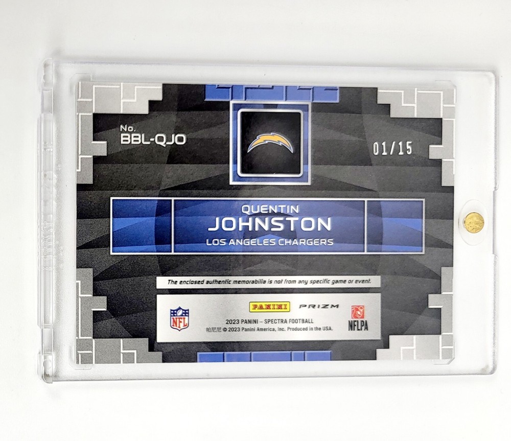 This rare and highly sought-after sports trading card features Quentin Johnston, a talented player from the TCU Horned Frogs and current member of the Los Angeles Chargers. The card is part of the 2023 Panini Spectra set and is a limited edition, with only 15 prints available. #1/15 Jersey #ed triple patch! In addition, this card boasts several exciting features, including a serial number, short print, parallel/variety, exclusive rookie insert, and memorabilia from Johnston's jersey. As a triple patch card, it is a must-have for any avid collector or football fan. Don't miss out on the chance to own this incredible piece of sports history. One touch not included. Card will be well protected and shipped in toploader case.