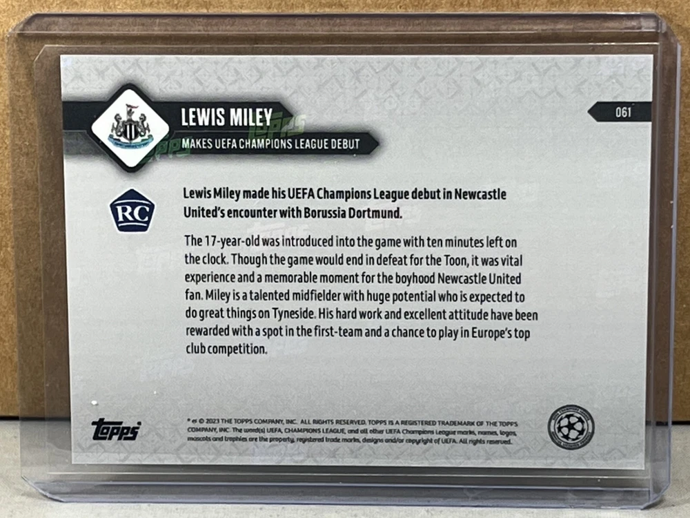 2023 TOPPS NOW UEFA #61 LEWIS MILEY NEWCASTLE UNITED ROOKIE makes UEFA Champions League debut. Purple parallel serial #'d 86/99. Worldwide shipping available. U.S. - Winning bidder to add $4.99 for careful USPS first class shipping with delivery confirmation. Add .50 for each additional item. All other countries - ship costs are calculated by eBay through international shipping program. Please message if interested in multiple items. Bid with confidence, 49000+ feedback. Thanks and check out my auctions ending every Sunday. Please note that combined ship rates are for items paid for on one invoice, thanks!