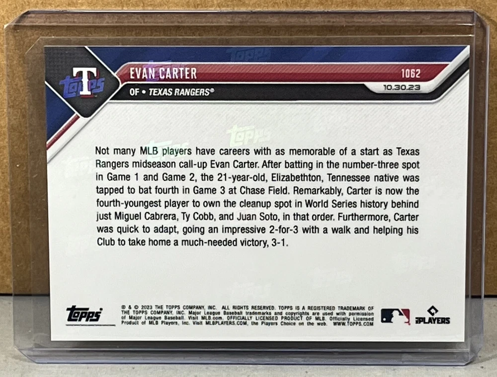 2023 TOPPS NOW #1062 EVAN CARTER TEXAS RANGERS Call-Up 4th youngest to bat clean up in the World Series. Print Run of 1253. The card pictured is the actual one you will receive. Worldwide shipping available. U.S. - Winning bidder to add $3.50 for careful USPS first class shipping with delivery confirmation. Add .50 for each additional item. All other countries - ship costs are calculated by eBay through international shipping program. Please message if interested in multiple items. Bid with confidence, 49000+ feedback. Thanks and check out my auctions ending every Sunday. Please note that combined ship rates are for items paid for on one invoice, thanks!