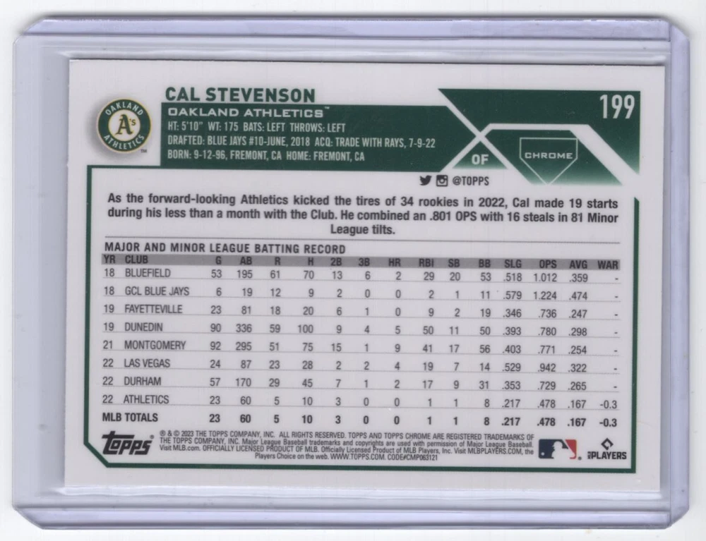 About Me Other Listings Feedback Add to Favorites Contact Me Striking Cards 901 2023 Topps Chrome Cal Stevenson Rookie Oakland Athletics #199 No stock photo / These are real scans or pictures Details Description: Cal Stevenson Category: Baseball Year: 2023 Product: Topps Chrome Team: Oakland Athletics Card Number: 199 Rookie: Yes Dimensions: 4" x 3" SKU: BL B0001 R01 K (8) Listing By Kronocard trading cards software v2.6.5.5