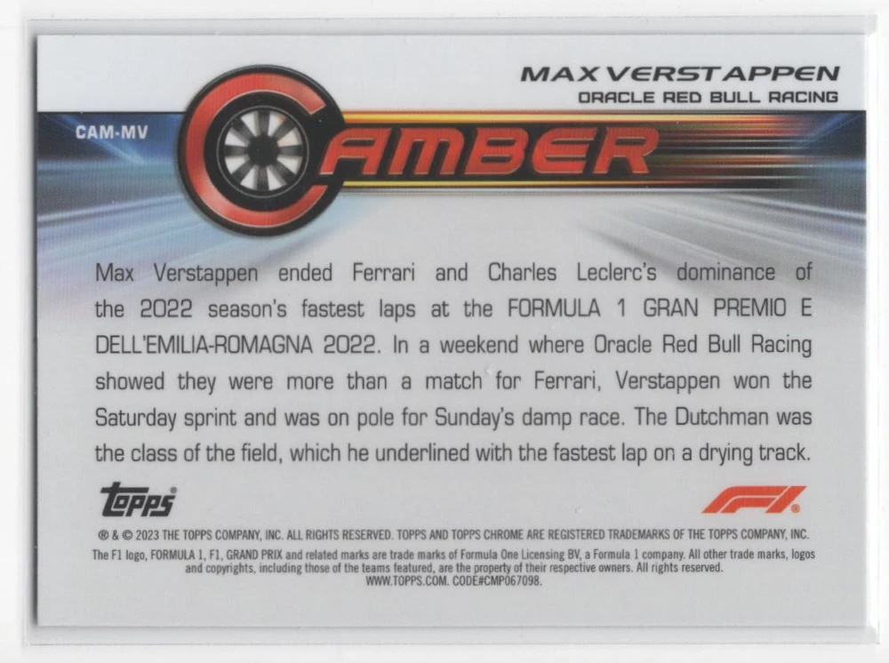 Franchise: Racing Graded: No Set: Topps Chrome Formula 1 Camber Game: Unspecified Type: Unspecified Team: Oracle Red Bull Racing Card Size: 3½" x 2½" Player/Athlete: Max Verstappen Original/Licensed Reprint: Original Card Name: 2023 Topps Chrome Formula 1 Camber Max Verstappen Oracle Red Bull Autographed: No Vintage: No Season: 2023 Year Manufactured: 2023 Card Number: CAM-MV Sport: Racing Character: Max Verstappen