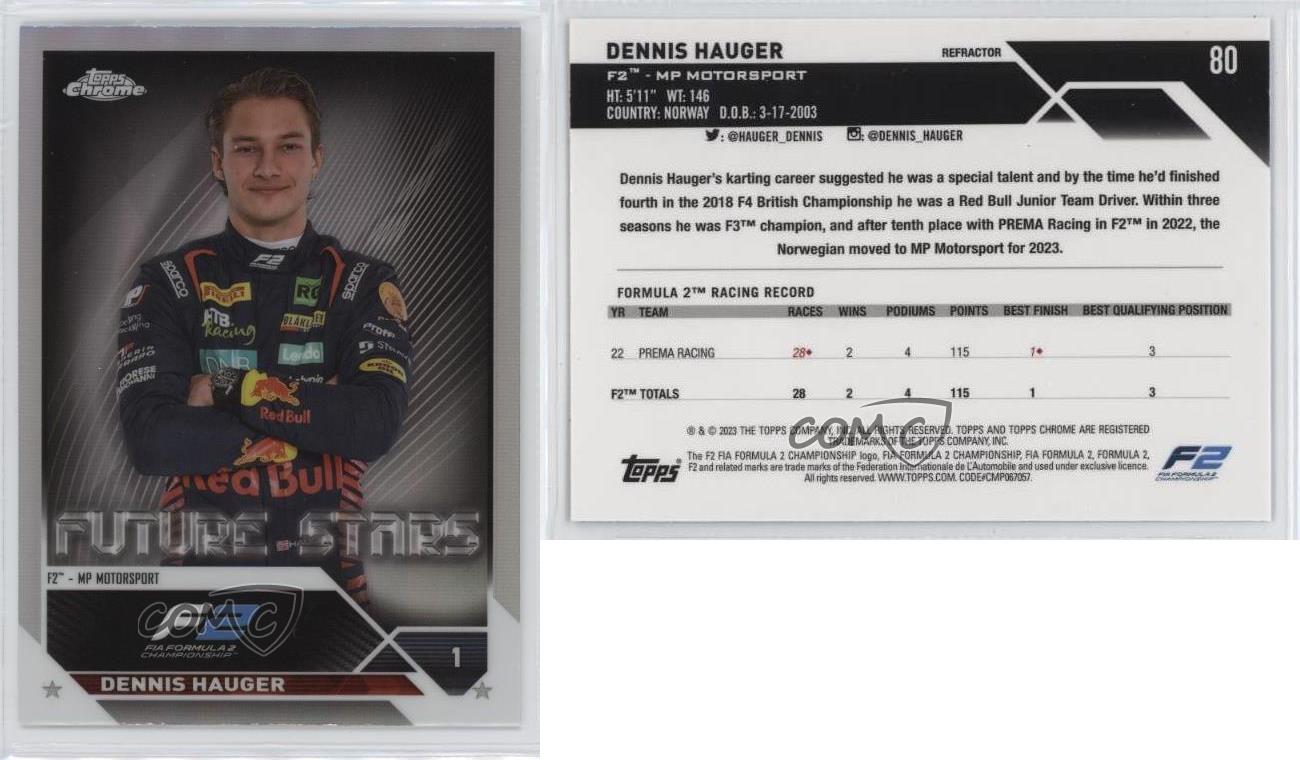2023 Topps Chrome Formula 1 - [Base] - Refractor #80 F2 Drivers - Dennis Hauger - Racing Card - Featuring the MP Motorsport - Featuring Dennis Hauger Search for more: 2023 Topps Chrome Formula 1 Search for more: 2023 Topps Chrome Formula 1 - [Base] - Refractor View all of our Listings Auctions Buy It Now About Us Located in the beautiful Pacific Northwest, COMC (Check Out My Cards) is the world's largest consignment service for trading card singles. More than 10,000 people have used our consignment service to list over 50 million trading cards. We currently house 20 million cards, each listed for sale with front and back images of the actual card. Find out how we can help you consign your items on eBay by contacting us through eBay messaging. COMC -- "The Safe & Easy Way to Buy & Sell" Representative Image - Select Specific Item above to see image of actual item Representative Image - Select Specific Item above to see image of actual item Raw Condition for Modern Cards Unless otherwise noted, raw modern cards are listed in Near Mint-Mint condition or better. A NM-MT card appears to be Mint at first glance, but upon closer inspection, may exhibit some of the following: minor print defects (e.g. roller marks, print line, dimple), minor scratches, slight edge wear, and slight corner wear. Centering is clearly visible in the images provided and does not factor into our condition assessment. Raw Condition for Vintage Cards Unless otherwise noted, raw vintage cards are listed in Excellent condition or better. An EX card may exhibit some of the following: minor rounding of corners, surface wear, print defects, light scratches, and slight edge wear/chipping. Centering is clearly visible in the images provided and does not factor into our condition assessment. Domestic Shipping Combined shipping for multiple items is available. To receive combined shipping, please ensure all desired items are in your eBay shopping cart before proceeding to checkout. eBay limits orders to 40 items per order. We automatically combine multiple orders placed on the same day. If you place multiple orders on the same day, please contact us to request a refund of applicable shipping costs. Signature confirmation may be required on invoices over $400. Raw cards are shipped in toploaders. International Shipping COMC offers eBay's International Shipping (EIS) for international orders under $2,500* (see country exceptions below). All duties and import fees are paid at checkout; in the rare event that there are additional import fees upon delivery, these are borne by the buyer. EIS packages route through a shipping hub in Erlanger, KY before shipping to their final destination. Please note that EIS does not allow for combined shipments. The shipping rates are determined by eBay and cannot be adjusted. *Maximum sale price exceptions: Colombia, Kuwait ($2,000); Taiwan ($1,539); Chile, Costa Rica, Guatemala, Honduras, Trinidad and Tobago ($1,000); Antigua and Barbuda, Aruba, Belize, Dominica, Grenada, Philippines, Saint Kitts and Nevis, Saint Lucia, Montserrat, Turks and Caicos Islands ($500); Dominican Republic, El Salvador ($200). Please request a shipping quote through eBay messaging for orders that exceed the maximum sale price supported by eBay's International Shipping. You will be responsible for all duties and import fees for international orders shipped outside the EIS. Raw cards are shipped in toploaders. Payment COMC does not accept offers on our cards through our eBay storefront. COMC utilizes eBay’s managed payments system. If you are experiencing difficulties making a payment, please contact eBay for assistance. Return Policy Returns are only accepted on the rare occasion the item is not as described. If you are making a return, please initiate the return process through eBay so a mailing label can be provided for you. Prior to listing, our expert team carefully assessed this item to represent it accurately. Please review the description and high-definition images prior to purchasing to ensure this item meets your satisfaction. We welcome you to contact us if you have further questions about this item. Trust and Integrity COMC carefully assesses each item consigned to us to prevent fraudulent items from entering the marketplace. If you believe an item offered on COMC may be fraudulent, please contact us with details so we can investigate the issue. Items we determine are outside our supported items policy may be removed. Last Modified: 12/24/2024 5:25:43 PM PDT