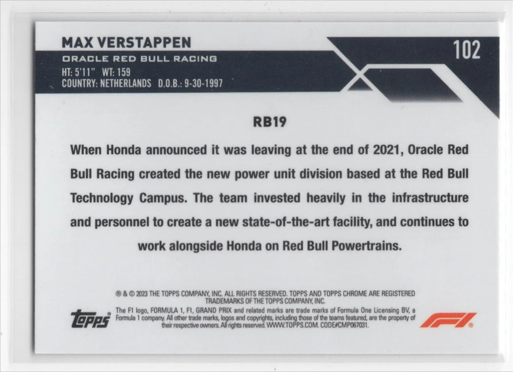 About Me Other Listings Feedback Add to Favorites Contact Me Striking Cards 901 2023 Topps Chrome Formula 1 Max Verstappen Oracle Red Bull Racing #102 No stock photo / These are real scans or pictures Details Description: Max Verstappen Category: Racing Year: 2023 Product: Topps Chrome Formula 1 Team: Oracle Red Bull Racing Card Number: 102 Dimensions: 3¾" x 2½" SKU: RA B0001 R01 B (122) Listing By Kronocard trading cards software v2.7.0.1