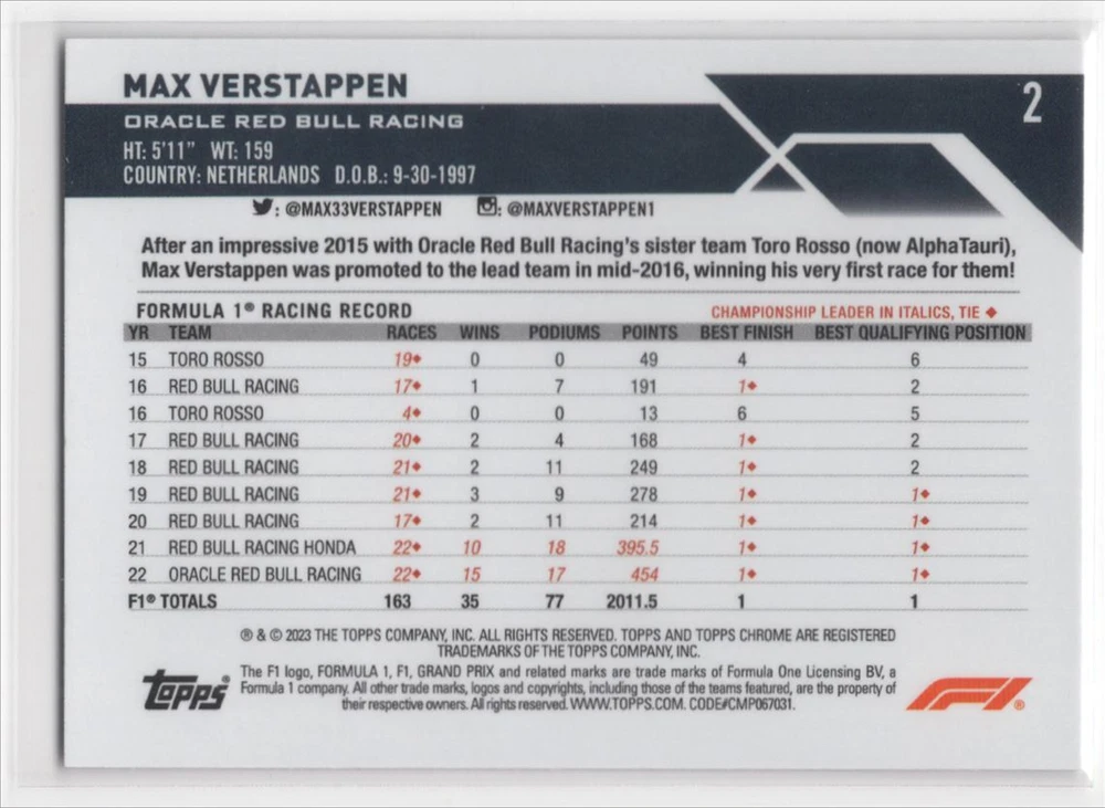 About Me Other Listings Feedback Add to Favorites Contact Me Striking Cards 901 2023 Topps Chrome Formula 1 Max Verstappen Oracle Red Bull Racing #2 No stock photo / These are real scans or pictures Details Description: Max Verstappen Category: Racing Year: 2023 Product: Topps Chrome Formula 1 Team: Oracle Red Bull Racing Card Number: 2 Dimensions: 3½" x 2½" SKU: RA B0001 R01 B (234) Listing By Kronocard trading cards software v2.7.0.1