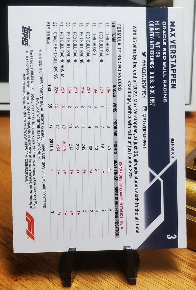 2023 Topps Chrome Formula 1 Max Verstappen Refractor #3 ORACLE RED BULL