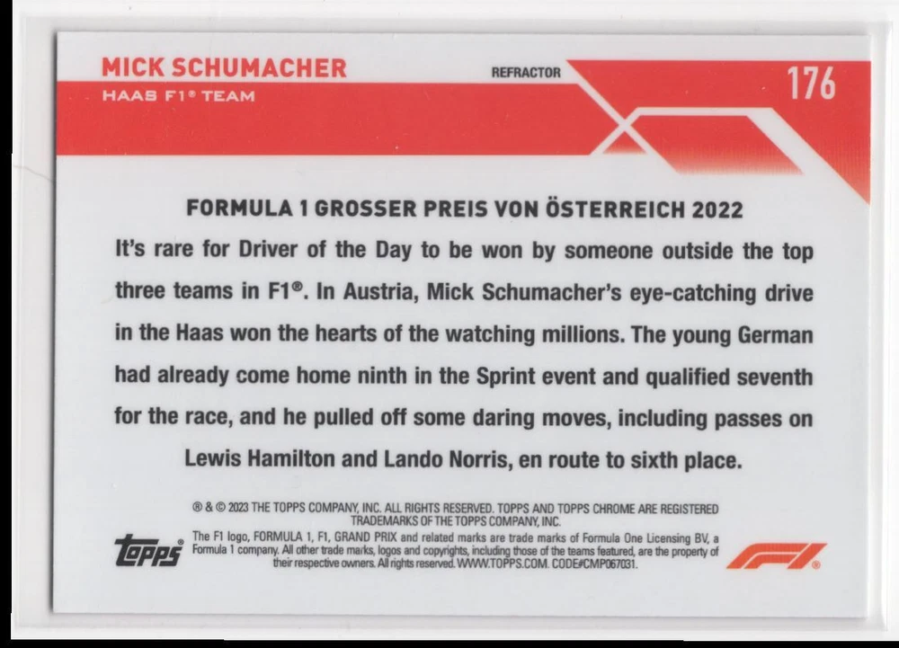 About Me Other Listings Feedback Add to Favorites Contact Me Striking Cards 901 2023 Topps Chrome Formula 1 Refractor Mick Schumacher Haas F1 Team #176 No stock photo / These are real scans or pictures Details Description: Mick Schumacher Category: Racing Year: 2023 Product: Topps Chrome Formula 1 Refractor Team: Haas F1 Team Card Number: 176 Dimensions: 3½" x 2½" SKU: RA B0001 R01 B (114) Listing By Kronocard trading cards software v2.7.0.1
