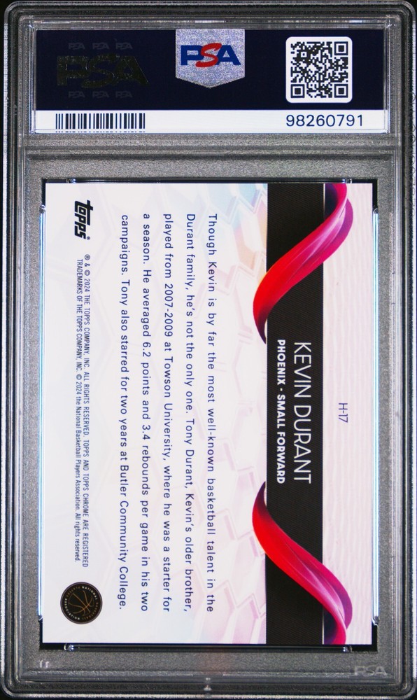 This is a 2023 Topps Chrome Kevin Durant trading card from the Helix insert set. It is a Short Print (SSP) with a Chrome finish, featuring a unique design. The card is made of 35 Pt. card stock and is number H17 in the set. Graded as a PSA 10 Gem Mint, it is a rare find with only 3 known to exist (POP 3). This card captures Durant in his Phoenix Suns team uniform, a special collectible for basketball fans.