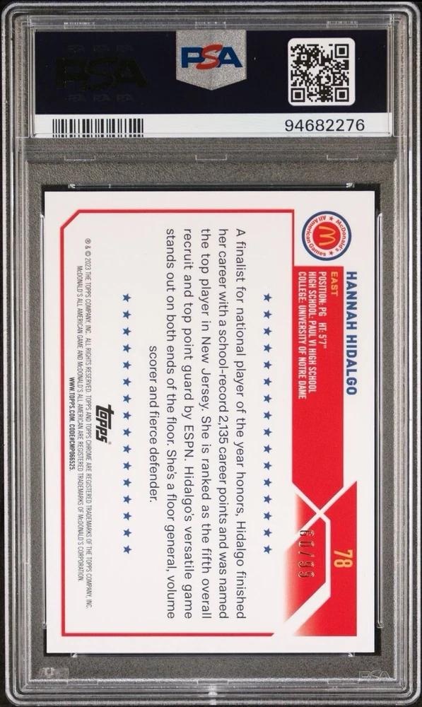 This 2023 Topps Chrome McDonald's All American sports trading card features Hannah Hidalgo of the Notre Dame Fighting Irish. The card is a blue mini diamond refractor parallel/variety and is serial numbered out of 99. It is an original card manufactured by Topps and is part of the 2023 set. The card is a standard size and is a rookie card for Hidalgo. It also features an autograph from the player. The card is a short print and is an excellent addition to any basketball trading card collection. Get your hands on this unique and rare card today!