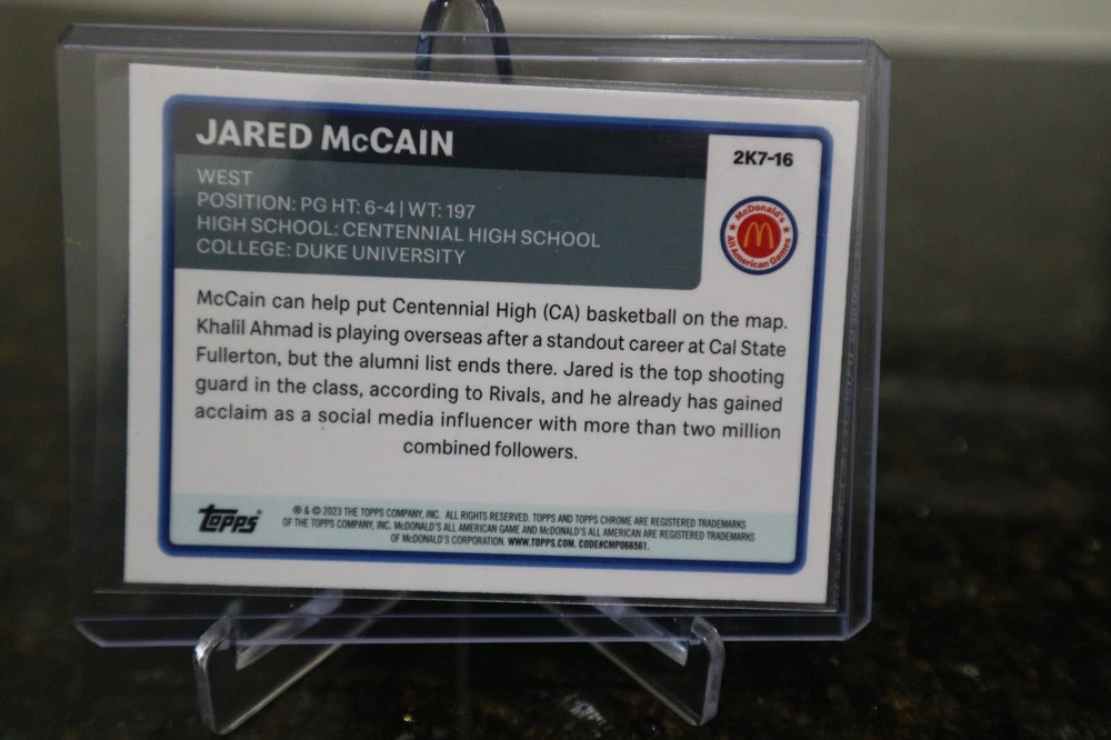 The product is a 2023 Topps Chrome McDonald's All American sports trading card featuring Jared McCain, a rookie basketball player. This card is part of the 2007 Topps McDonald's All-American insert set, making it a unique and collectible item for fans and trading card enthusiasts. The card showcases McCain as a standout player from the McDonald's All American game, adding value to any sports card collection.