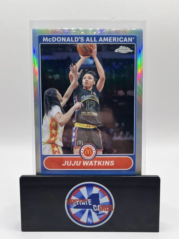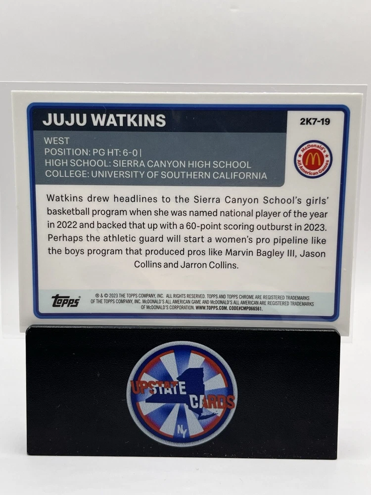 The product is a 2023 Topps Chrome McDonald's All American trading card featuring JuJu Watkins of the USC Trojans basketball team. This card is part of the 2007 Insert Set, with a card number of 2K7-19. It is a Refractor parallel variety card, showcasing a Rookie player. The card is manufactured by Topps and is a Short Print for the 2023 season.